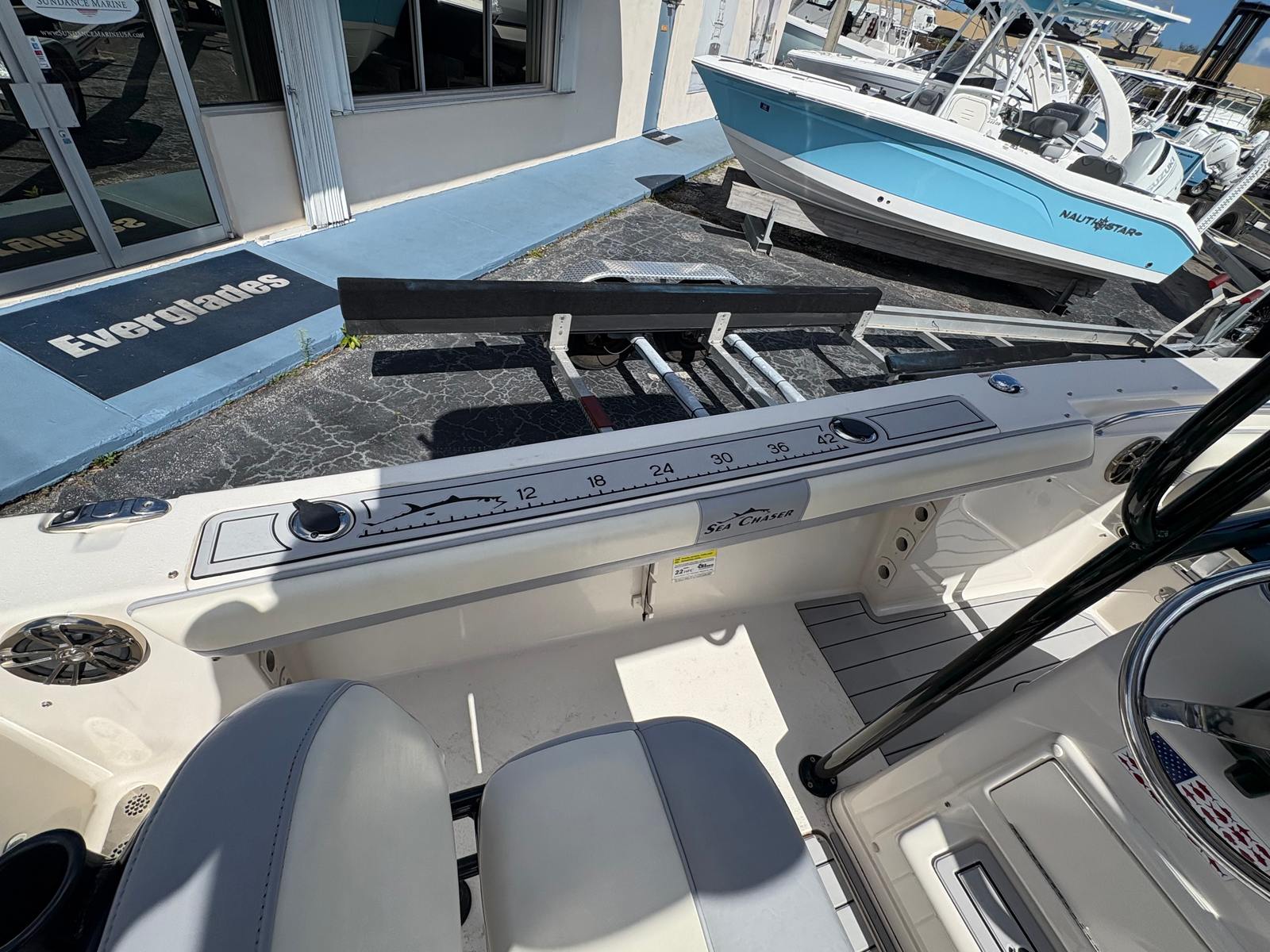Premium Touches: Blue/White LED courtesy lighting, premium diamond-pleated upholstery, stainless steel cup holders, and an ultra leaning post featuring a removable 70-quart marine cooler.