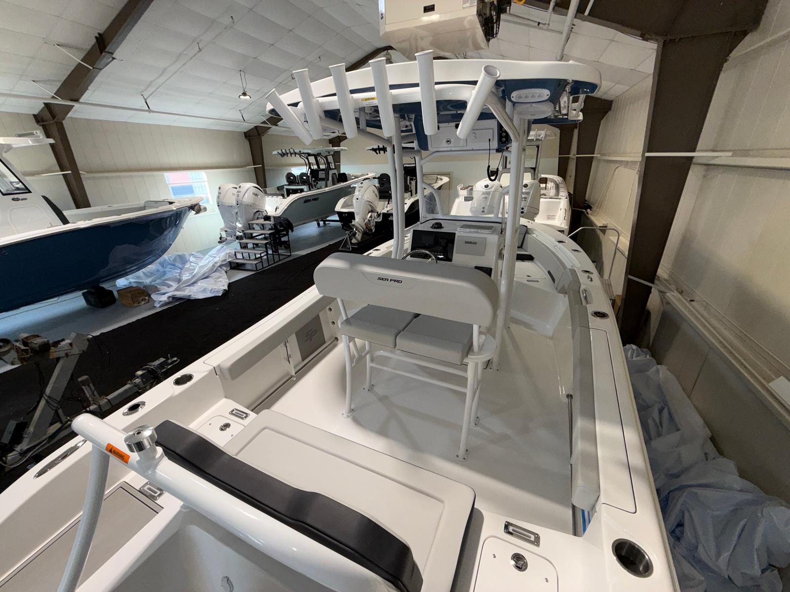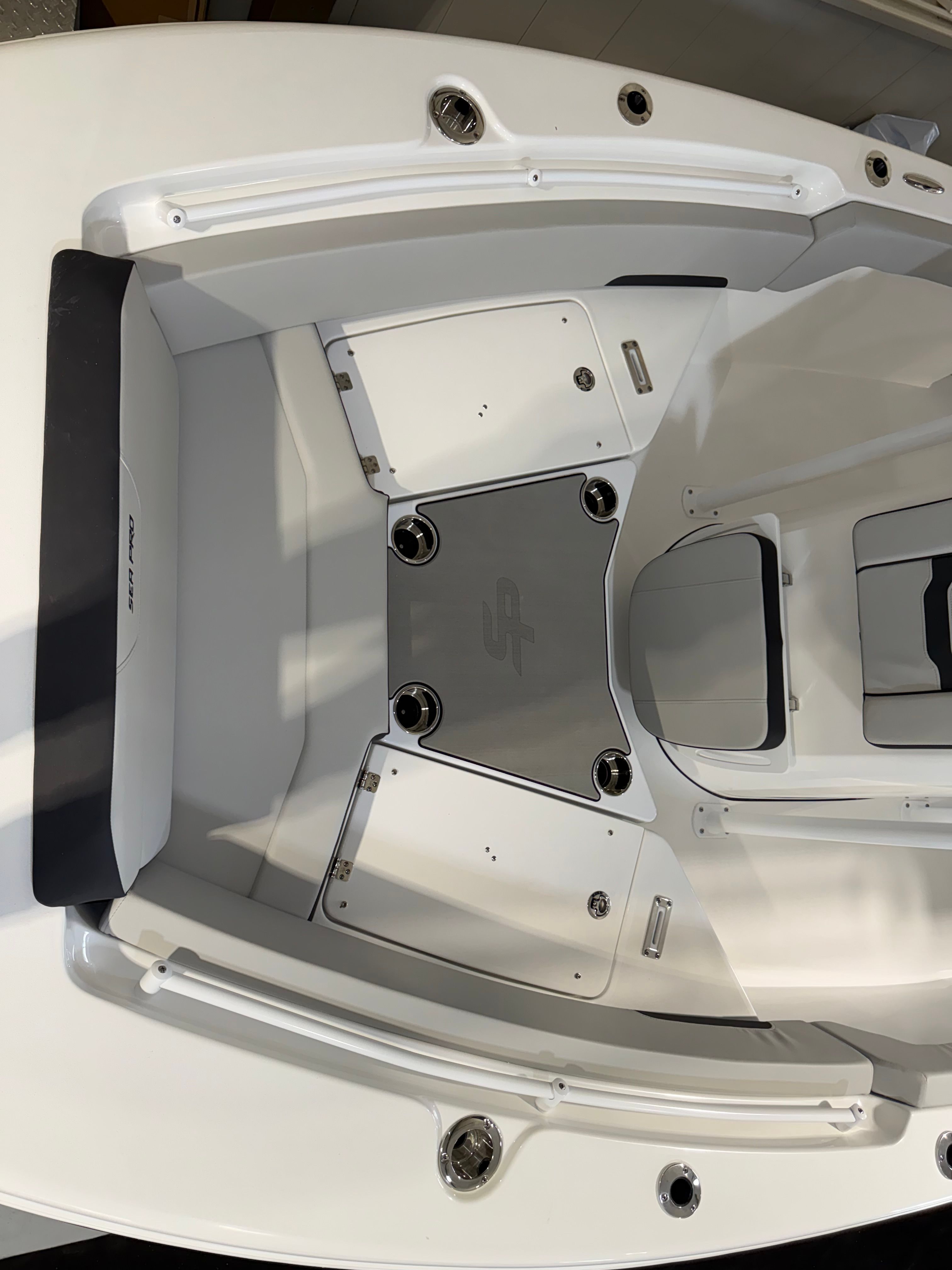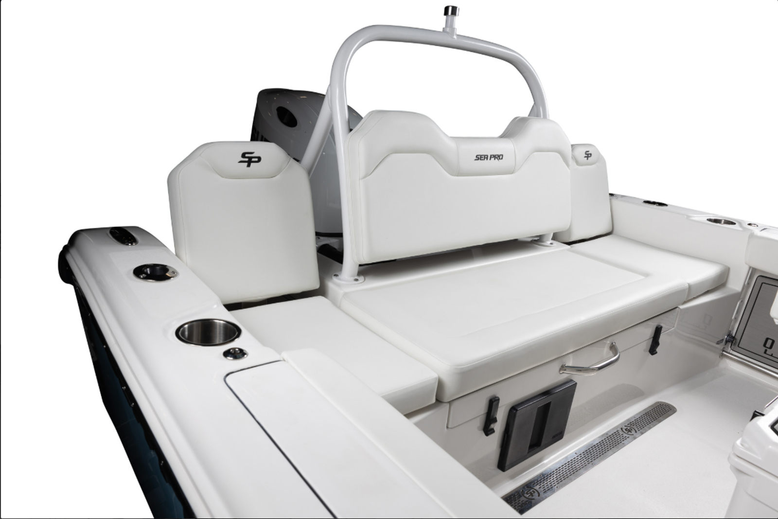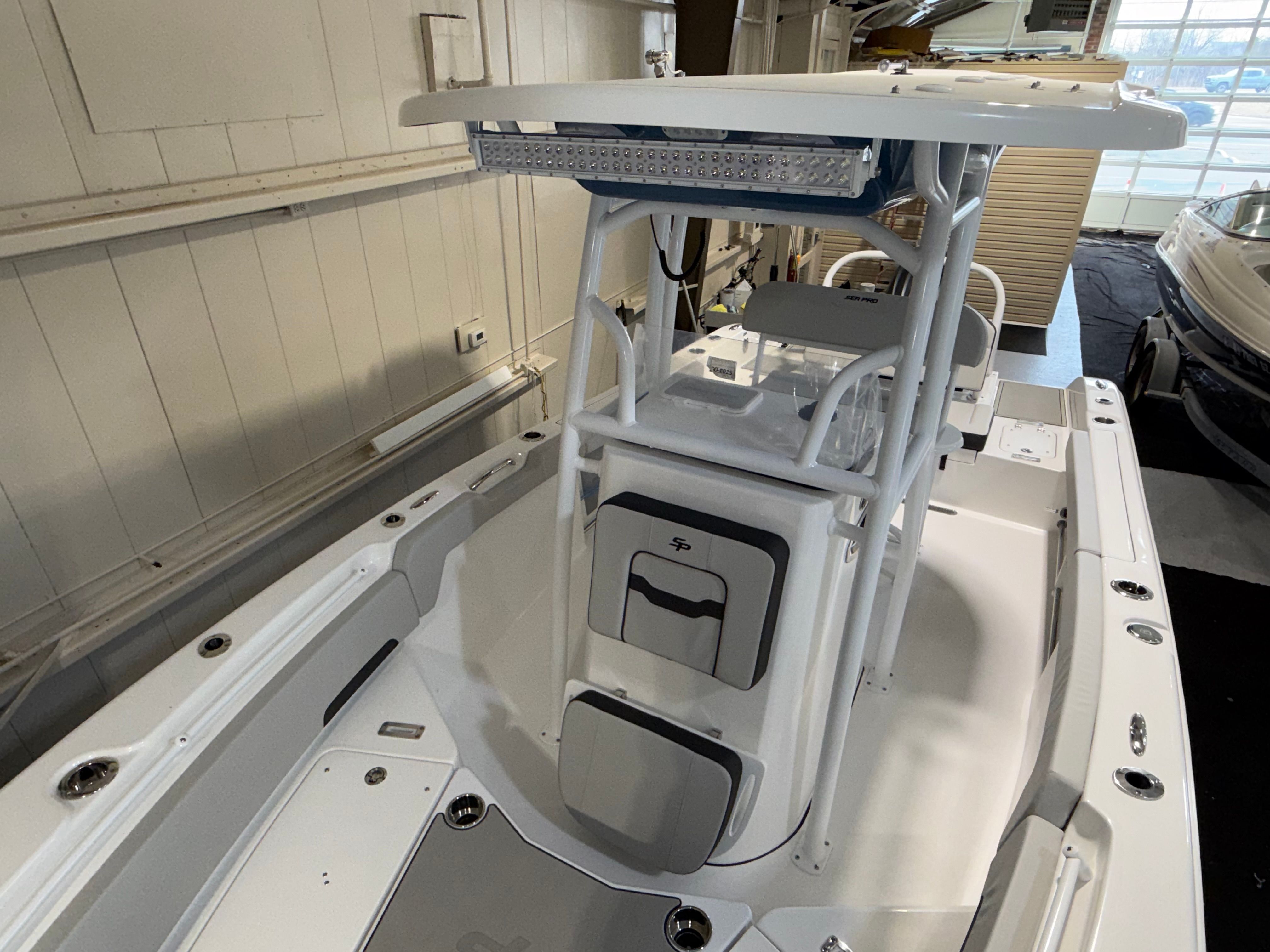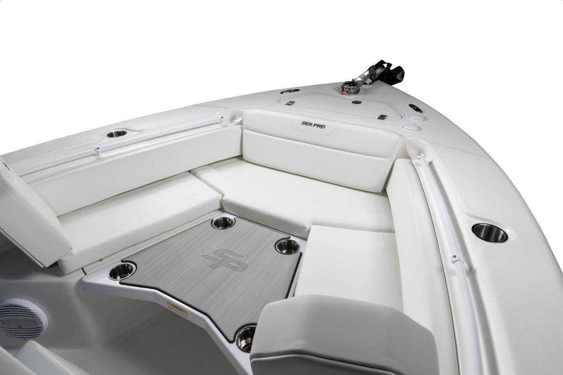 The Sea Pro 225 Flxr is loaded with special features that enhance both functionality and comfort. Communication and safety are prioritized with the VHF Radio RS20, allowing you to stay connected while on the water. The hull and deck are equipped with a fresh water wash down and sink, making it easy to clean up after a day of fishing or water sports. Four stainless steel cup/rod holders provide convenient storage for beverages and fishing gear, ensuring that everything you need is always within reach.A fiberglass hard top T-top offers superior protection from the sun and elements, while the white powder coat finish adds a touch of elegance and durability. The helm is outfitted with a wireless phone charger and holder, keeping your devices powered and secure throughout your journey. For those sunny days when you want extra shade, the sun shade bow (including two rod holders) provides a comfortable retreat at the front of the boat. The underside of the T-top features a beautiful Carolina Blue color, complementing the crisp white upholstery for a fresh, modern look.