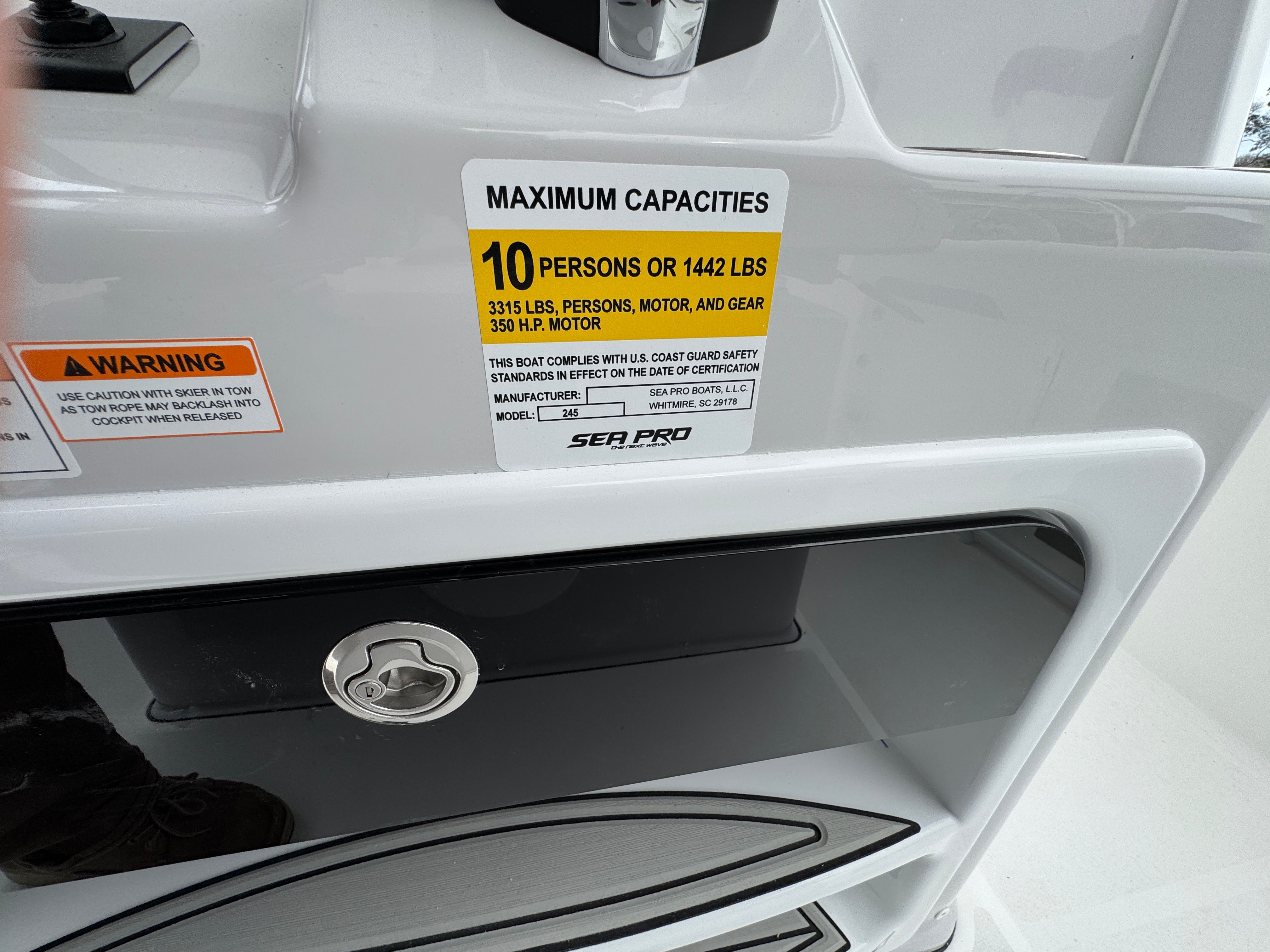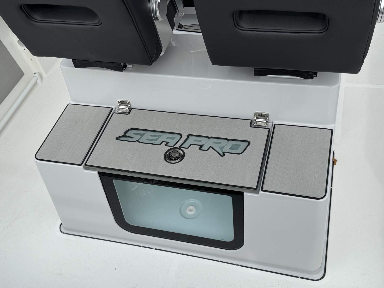The Sea Pro 245 Flxr is loaded with premium features designed to enhance your boating experience. The hard top with windshield enclosure offers excellent protection from the elements, allowing you to enjoy your time on the water in comfort regardless of the weather. The premium leaning post with rotating captain's chairs provides superior support and flexibility, making long days at the helm more enjoyable. Bow seating with removable backrests ensures that your guests can relax in comfort, while the bow table with cushion transforms the front of the boat into a perfect spot for socializing, dining, or simply soaking up the sun. Every detail, from the Platinum upholstery to the White powder-coated finishes, reflects Sea Pro's commitment to quality and craftsmanship.