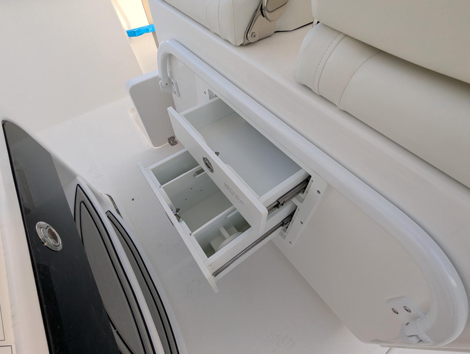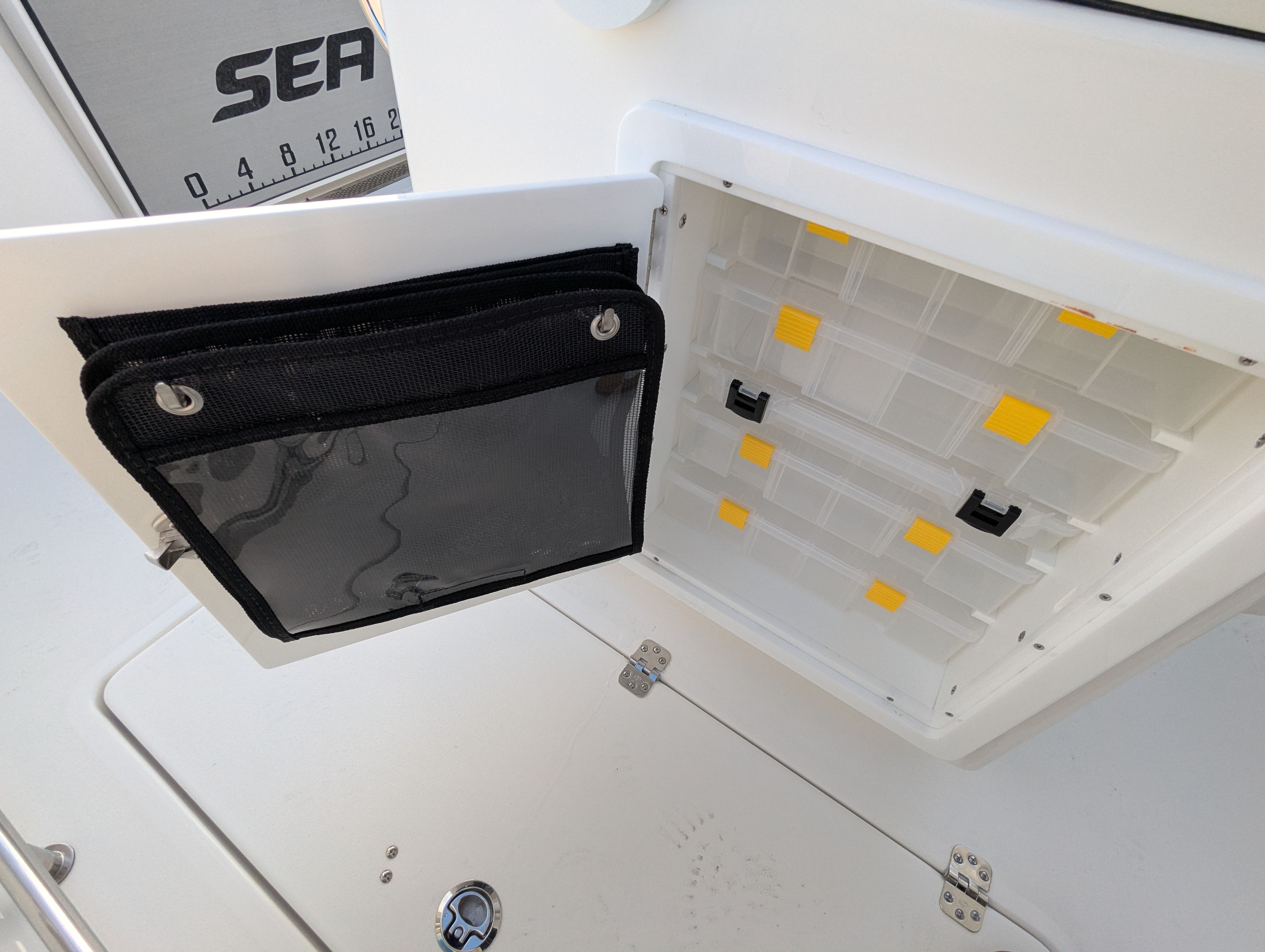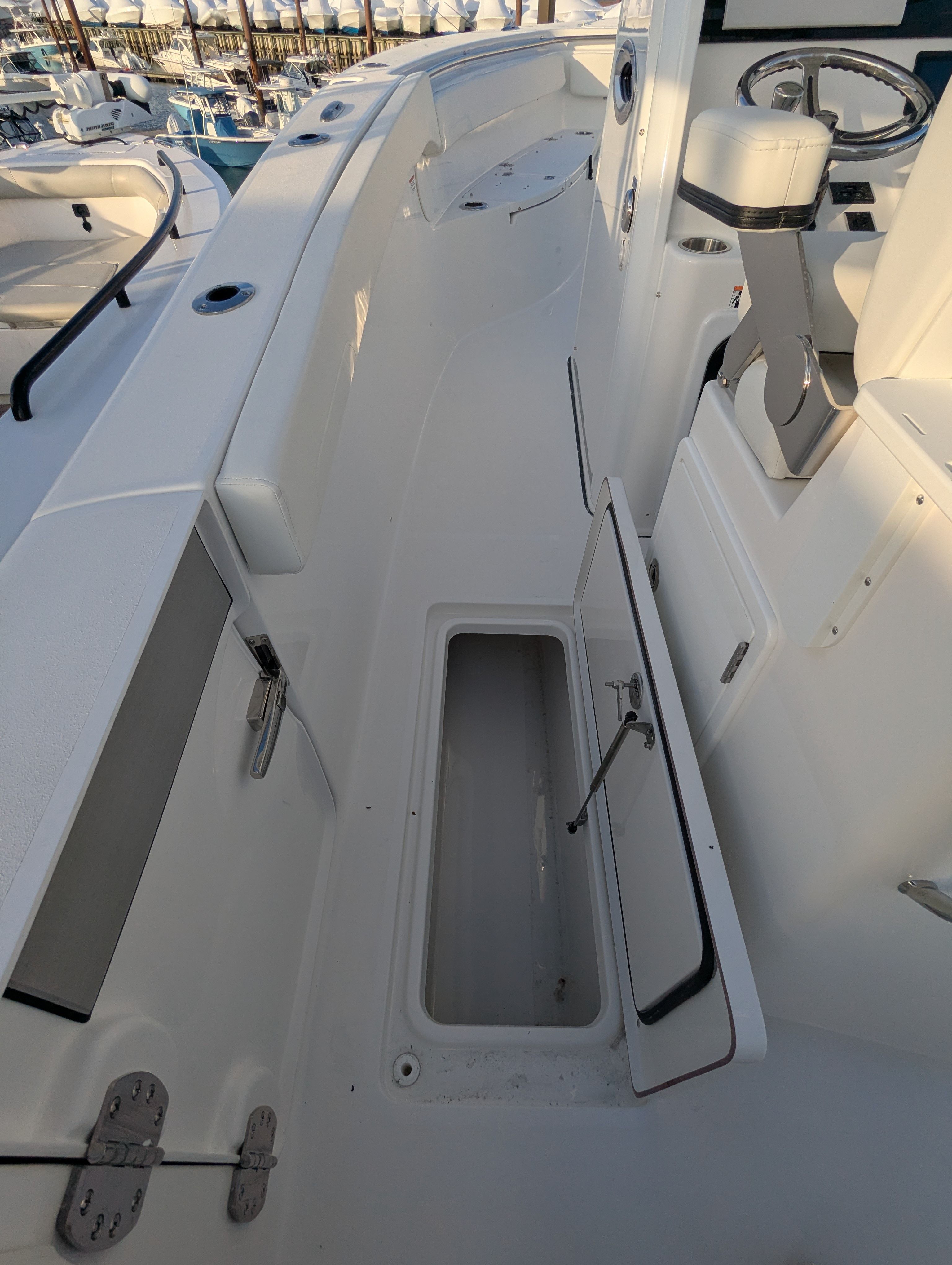 The Sea Pro 262 DLX is packed with special features designed to enhance your time on the water. Communication and safety are prioritized with the VHF Radio RS20, allowing you to stay connected and informed during your adventures. Comfort is at the forefront, thanks to the Console Seat Cover, Helm Pad in Titanium, and Leaning Post Cover, which protect key areas and add a touch of luxury to your boating environment. The Dash Panel Cover keeps your controls shielded from the elements, ensuring longevity and ease of use.Upholstery options on the 262 DLX are second to none. Enjoy Bow Seating with Removable Backrest for flexible lounging, a Complete Bolster Package for added comfort and support, and a Bow Table with Cushion for convenient dining or socializing. The powdercoating in Hammer Gray adds a modern, durable finish to key components, while the console’s crisp white color provides a clean, sophisticated look.