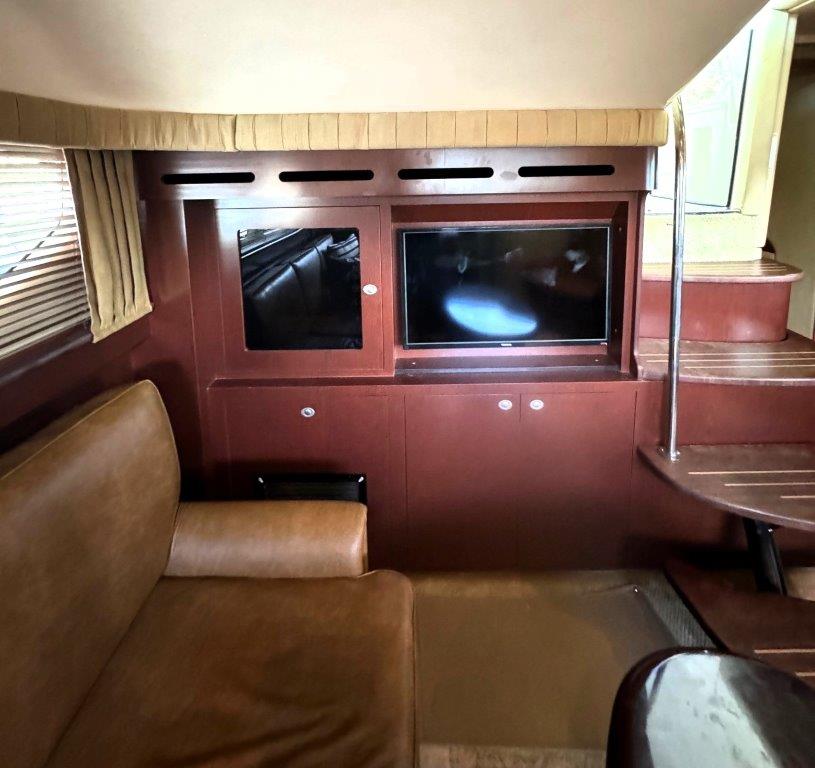The salon is bright and open, perfect for entertaining, with a fully equipped galley that will please any onboard chef. Head up to the fully enclosed bridge, where A/C and heating let you cruise in comfort year-round — all while enjoying panoramic 360° views.