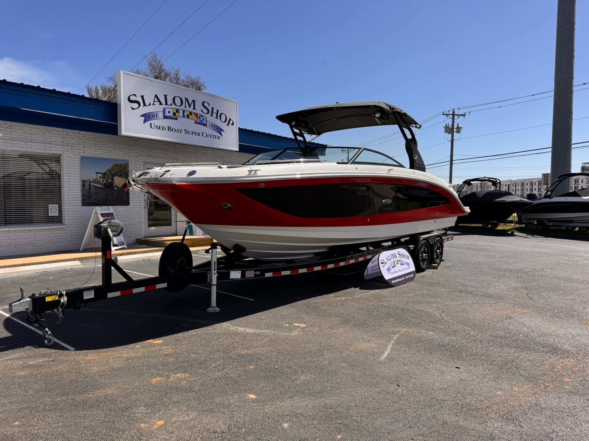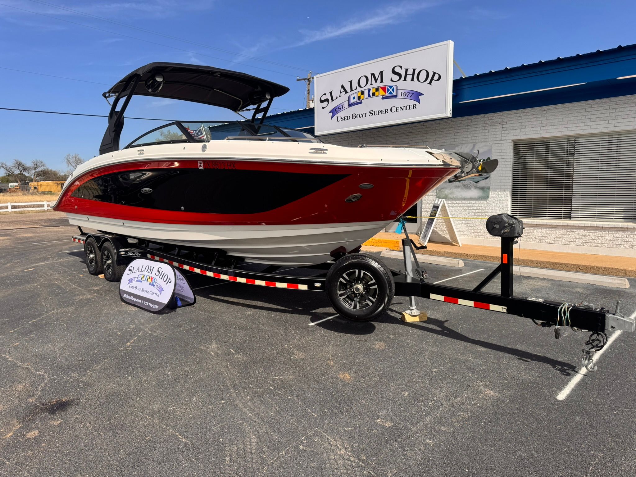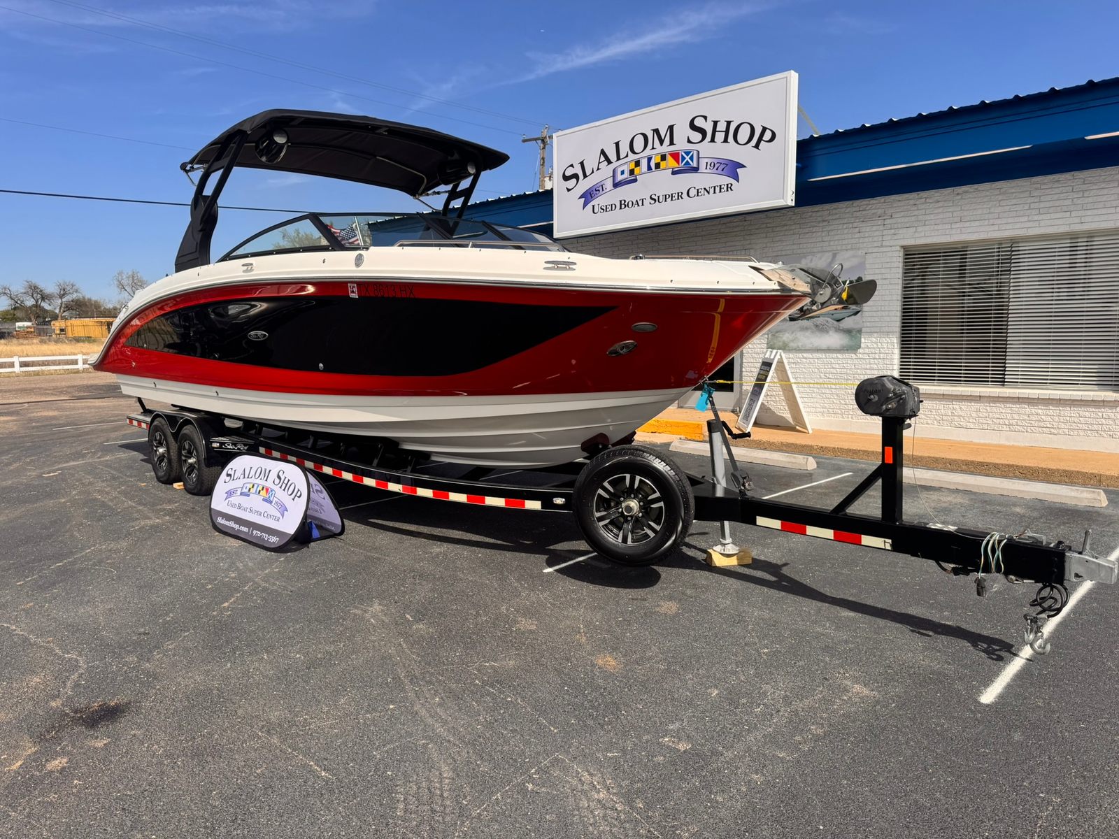 Now available at our Used Boat Super Center in Lewisville, this 2020 Sea Ray SDX 290 is a premium luxury deck boat designed for entertaining, watersports, and long days on the lake. Finished in a freshly buffed red and black gelcoat with a tan interior, this SDX 290 is powered by a MerCruiser 8.2L V8 producing 380 horsepower with only 82 hours and dual stainless steel 3-blade props.