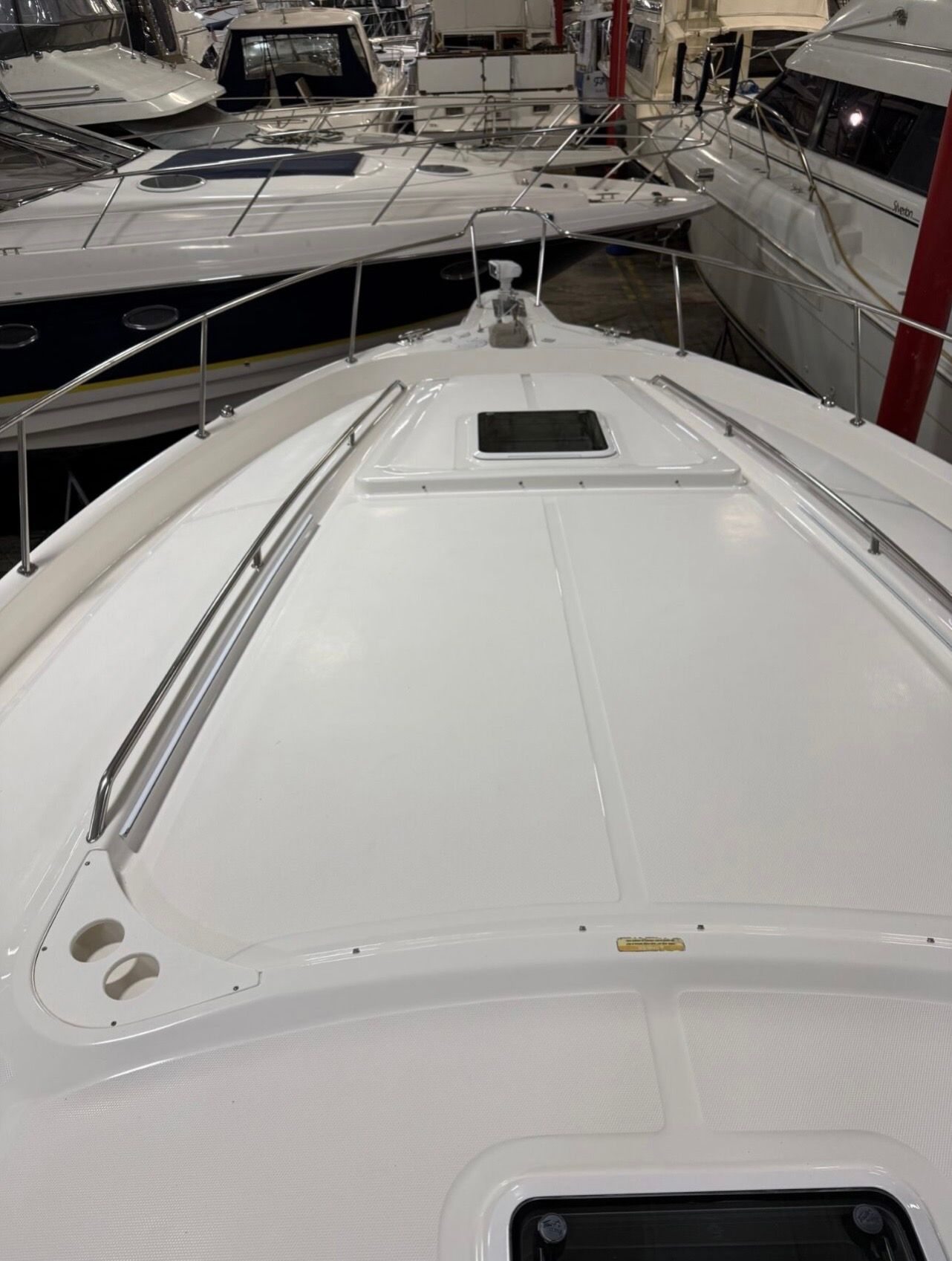The 460 Sundancer is as practical as it is stylish. The five-battery system and battery charger provide peace of mind, ensuring your boat is always ready for action. The electric engine hatch streamlines maintenance, while the cockpit coaming bolsters and carpet enhance safety and comfort. The extended swim platform makes water sports, swimming, and boarding the boat a breeze, adding to the overall convenience and enjoyment of ownership.Docking and maneuvering are made easier by the boat’s responsive handling and well-designed layout. The hard top offers protection from sun and rain, allowing you to make the most of your time on the water, regardless of the conditions. Whether you are planning a day trip or a weekend getaway, this bowrider boat for sale is equipped to handle all your boating needs.