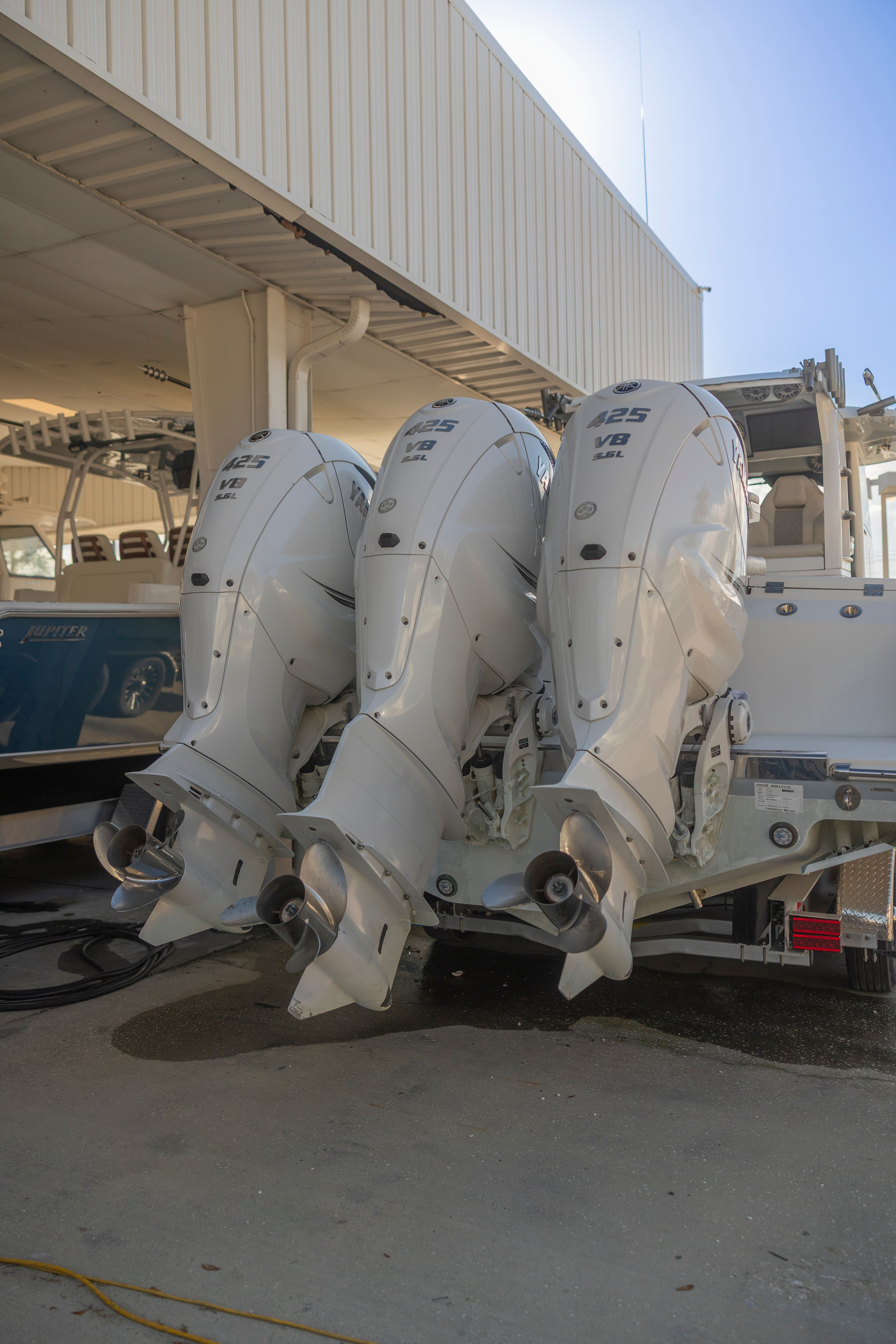Powering the Solace 41 CS are three Yamaha V8 425 XTO outboard engines, delivering a combined 1275 horsepower. These triple engines, finished in Pearlescent White, offer exhilarating acceleration, smooth cruising, and reliable offshore capability. With the advanced Helm Master system, you’ll enjoy precise control and effortless maneuvering, whether docking in tight spaces or navigating open waters. The low engine hours further ensure that these engines are ready to provide years of dependable performance, making this Center Console boat for sale a smart investment for serious boaters.