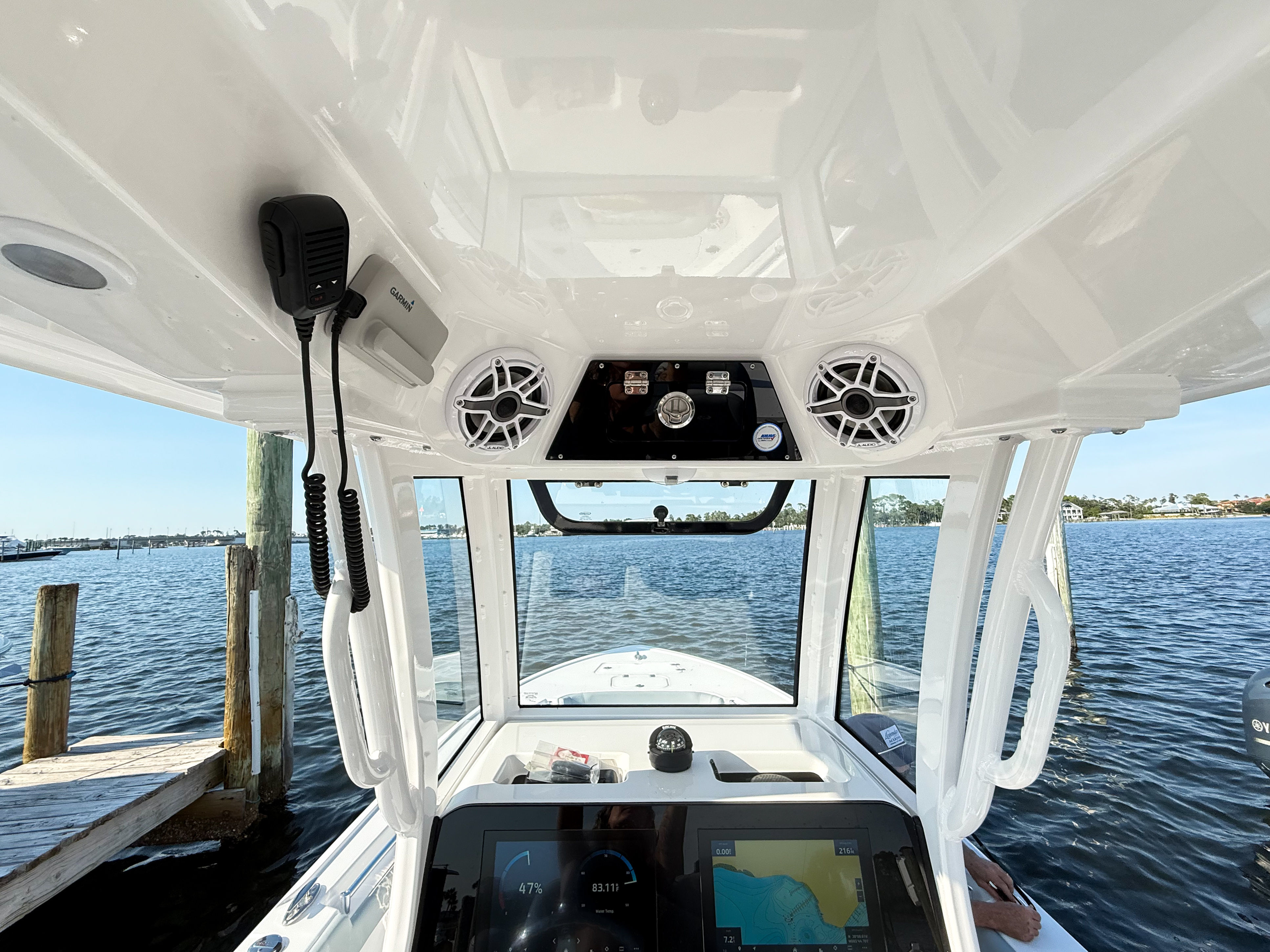 The Sportsman Masters 247 OE is packed with premium features that elevate your boating experience. Under the leaning post, you’ll find dedicated tackle storage, keeping your gear organized and easily accessible for spontaneous fishing adventures. Navigation and entertainment are enhanced by the dual Garmin GPSMAP® 1243xsv 12" screens, providing cutting-edge chart plotting, fish finding, and system monitoring capabilities. The Garmin Fusion®/JL Audio Ultra Premium DSP Upgrade ensures your favorite tunes sound crystal clear, creating the perfect atmosphere for relaxation or celebration.Practicality meets luxury with the slide-out track designed for a YETI® cooler, allowing you to keep refreshments cold and within reach. The smokey gray upholstery adds a touch of sophistication and comfort, while the hardtop underside in snow white offers shade and protection from the elements. The hull side and bottom, also finished in snow white, contribute to the boat’s sleek, unified appearance. For added convenience, the ProMariner ProTournament Elite 3 Battery Charger (5-Bank) keeps your batteries charged and ready for action, ensuring you’re always prepared for a day on the water. The white powder coating throughout the boat not only enhances durability but also maintains a clean, polished look.