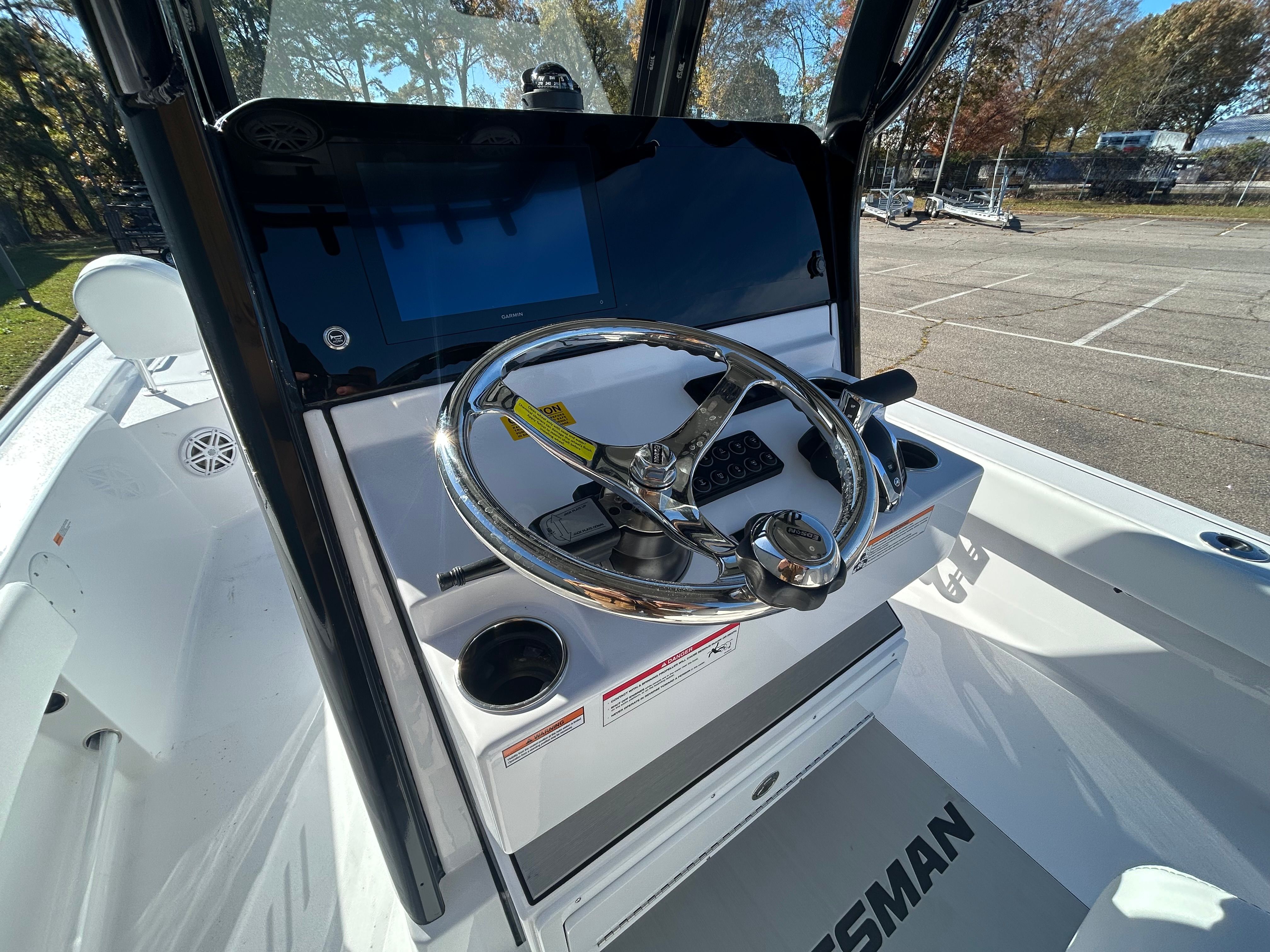 The Sportsman Masters 247 is loaded with features designed to enhance your boating experience. The Bow Cushion Set and Sundeck provide a comfortable space for relaxation and sunbathing, while the Removable Bow Backrest with Seat Cushions offers flexible seating options for guests. The Edson 13” Stainless Steel Comfort Grip Steering Wheel with PowerKnob delivers precise control and effortless maneuvering, making every trip enjoyable for the captain.For anglers, the Garmin Force Kraken Trolling Motor (75", White) offers advanced navigation and positioning, allowing you to fish with precision and ease. The ProMariner ProTournament Elite 3 Battery Charger (2-Bank) ensures your electronics and trolling motor stay powered throughout the day, so you can focus on the fun without worry. Under the leaning post, you’ll find convenient tackle storage, keeping your gear organized and within reach.The Shadow Gray hull and Icecap White upholstery not only look fantastic but are also designed for durability and easy maintenance. Every detail of the Masters 247 reflects Sportsman’s commitment to quality and innovation.