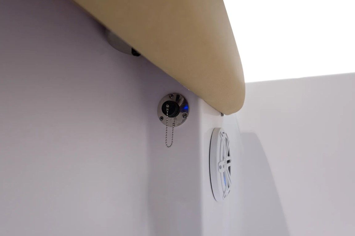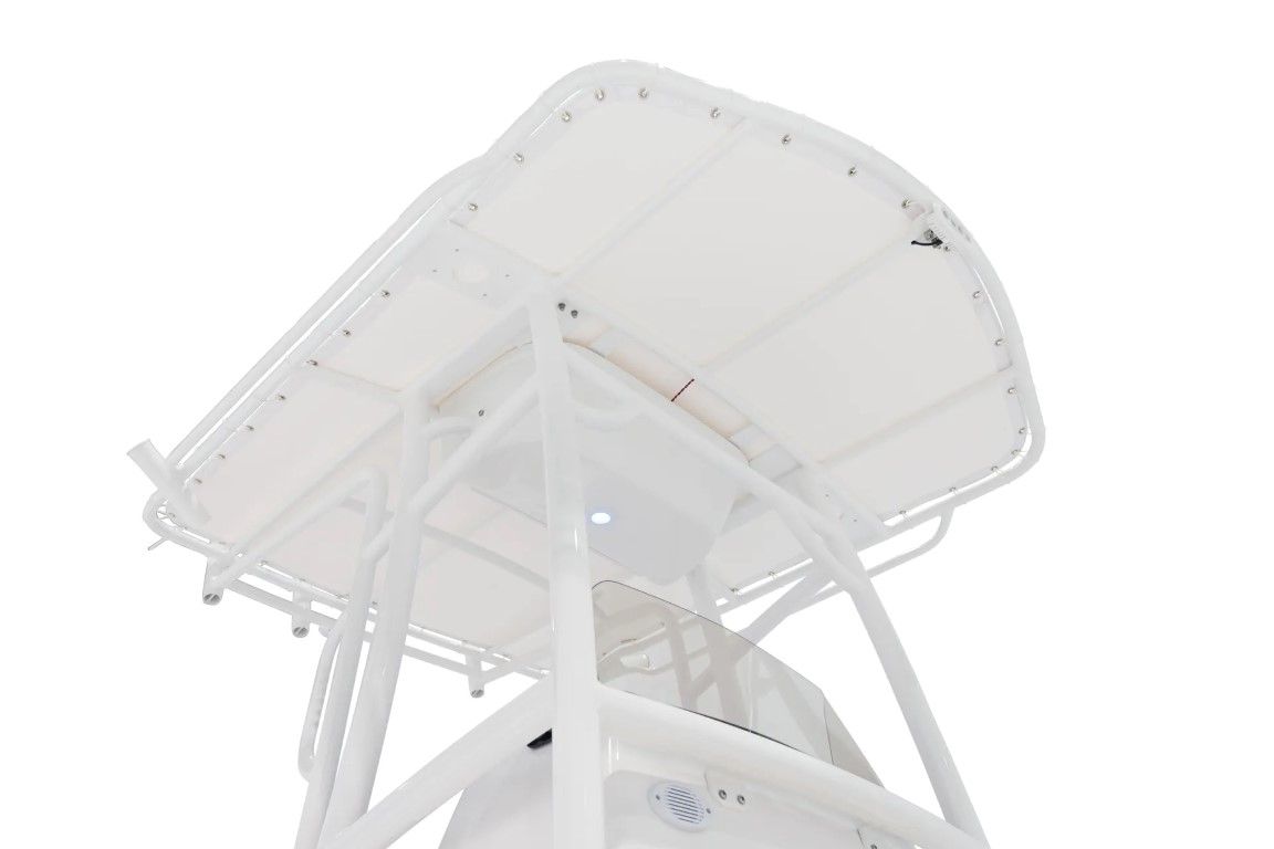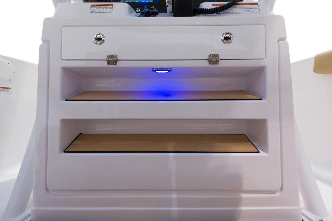 The Sportsman Open 232 is loaded with premium features that enhance both functionality and comfort. The hull and bottom are finished in the striking Explorer Blue, creating a bold and stylish presence on the water. The fiberglass console is thoughtfully designed with a footrest and storage, offering both convenience and ergonomic support during long days at sea. The fiberglass hard top, complete with LED lighting, provides shade and illumination, while the hardtop underside in Explorer Blue adds a custom touch that ties the entire design together.White powder coating adds a clean, modern look to the boat’s framework, complementing the Serenity Sileather Icecap White upholstery. This premium seating material is both durable and comfortable, ensuring that every passenger enjoys a relaxing ride. The dual chair leaning post with flip-up bolsters offers versatile seating options, whether you prefer to sit back or stand while navigating. The Garmin 12" GPS screen with built-in Wi-Fi keeps you connected and informed, making navigation and trip planning effortless.For those who love to relax at the bow, the removable sundeck/table with cushion transforms the front of the boat into a social hub or sunbathing area. This flexible space is perfect for entertaining guests, enjoying a meal, or simply soaking up the sun.
