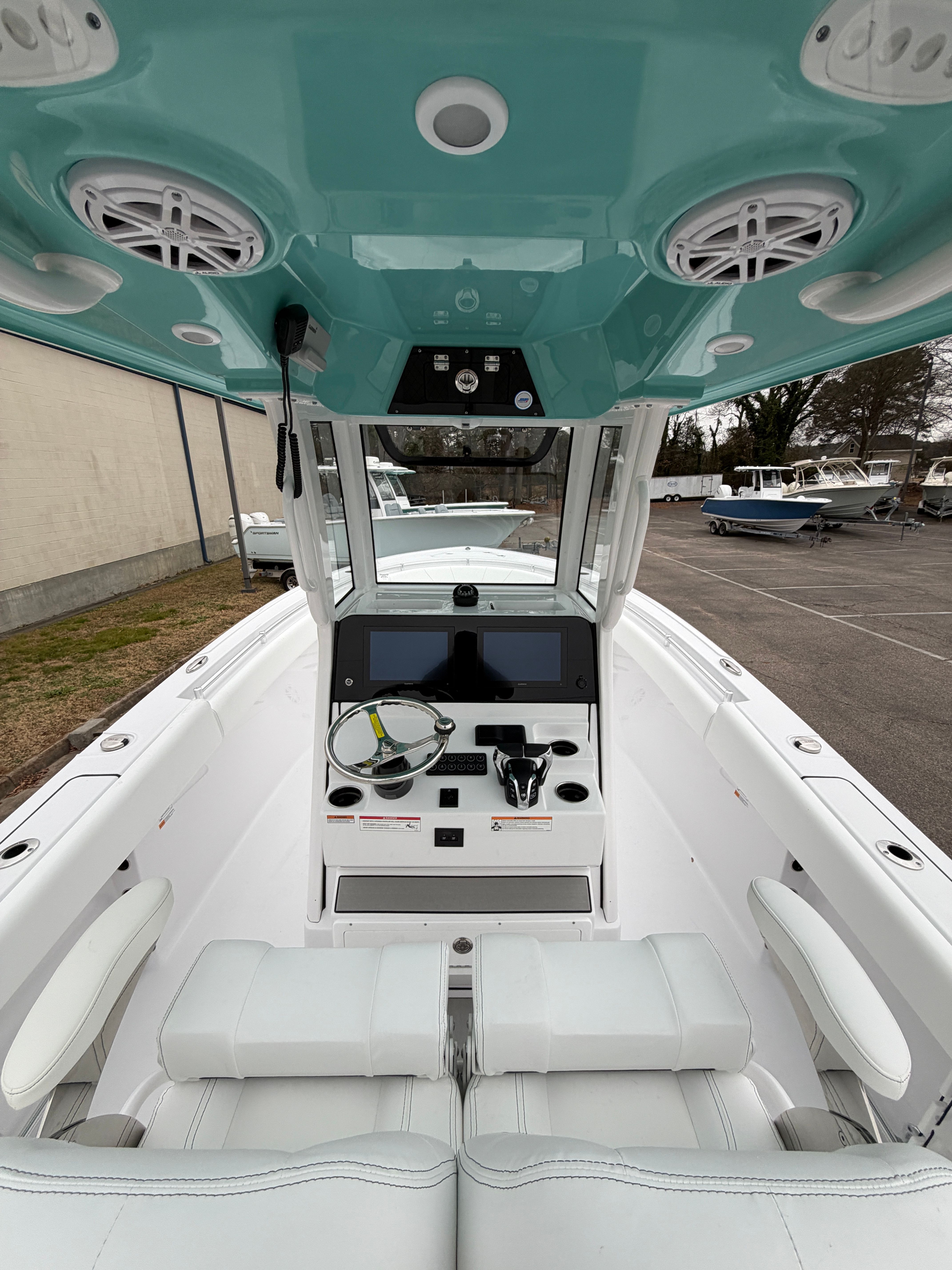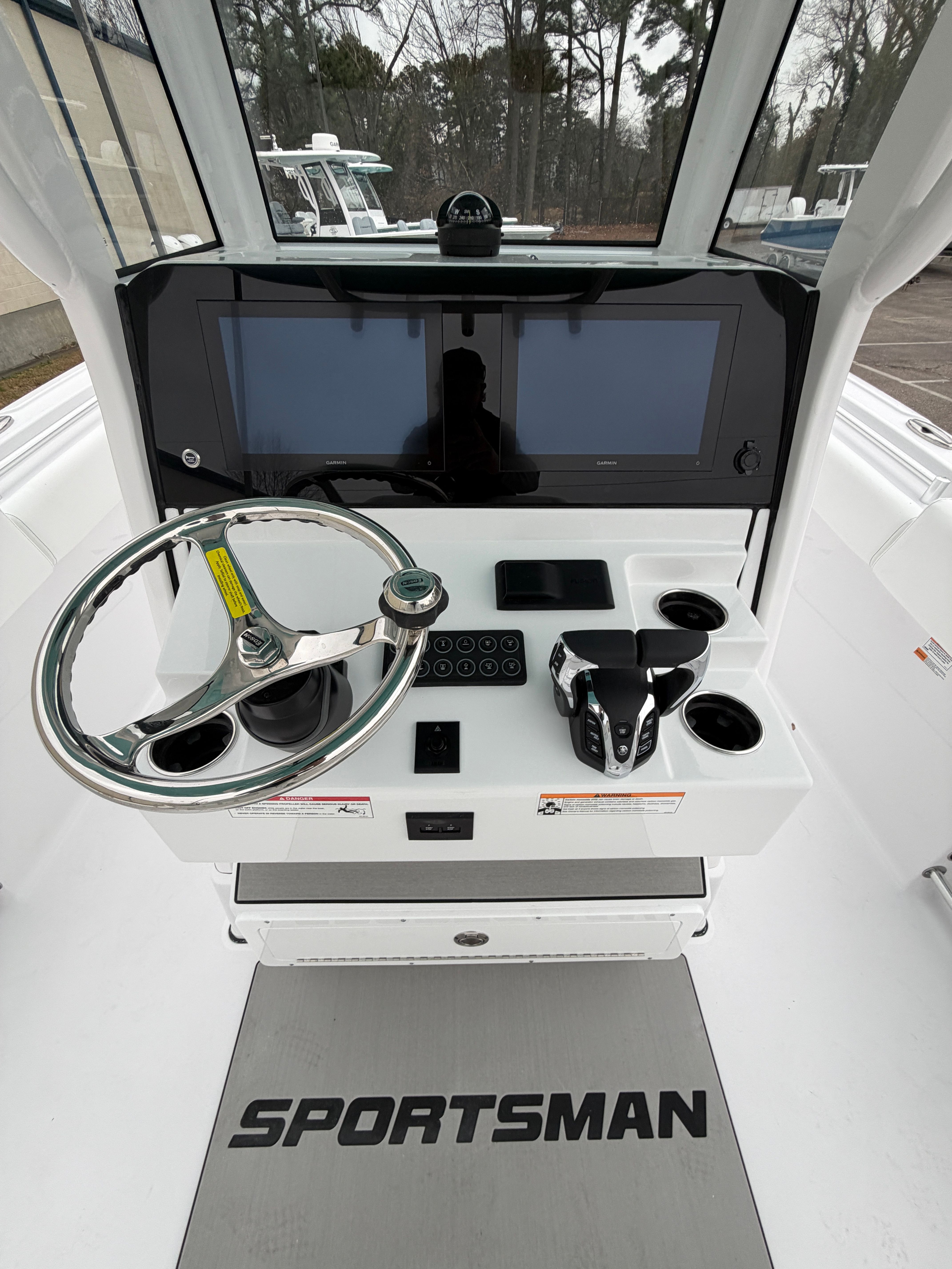 Power and reliability are at the heart of the Sportsman Open 252. Equipped with twin Yamaha F150XSA2 engines, each delivering 150 horsepower, this center console boat offers a total of 300 horsepower for exhilarating performance. The white engines not only enhance the boat’s visual appeal but also reflect the premium quality associated with Yamaha’s renowned engineering. Whether you are accelerating to your favorite fishing spot or cruising along the coastline, the Open 252 provides smooth, responsive handling and impressive speed. The Edson 13” stainless steel comfort grip steering wheel with PowerKnob ensures precise control, making navigation effortless even in challenging conditions.