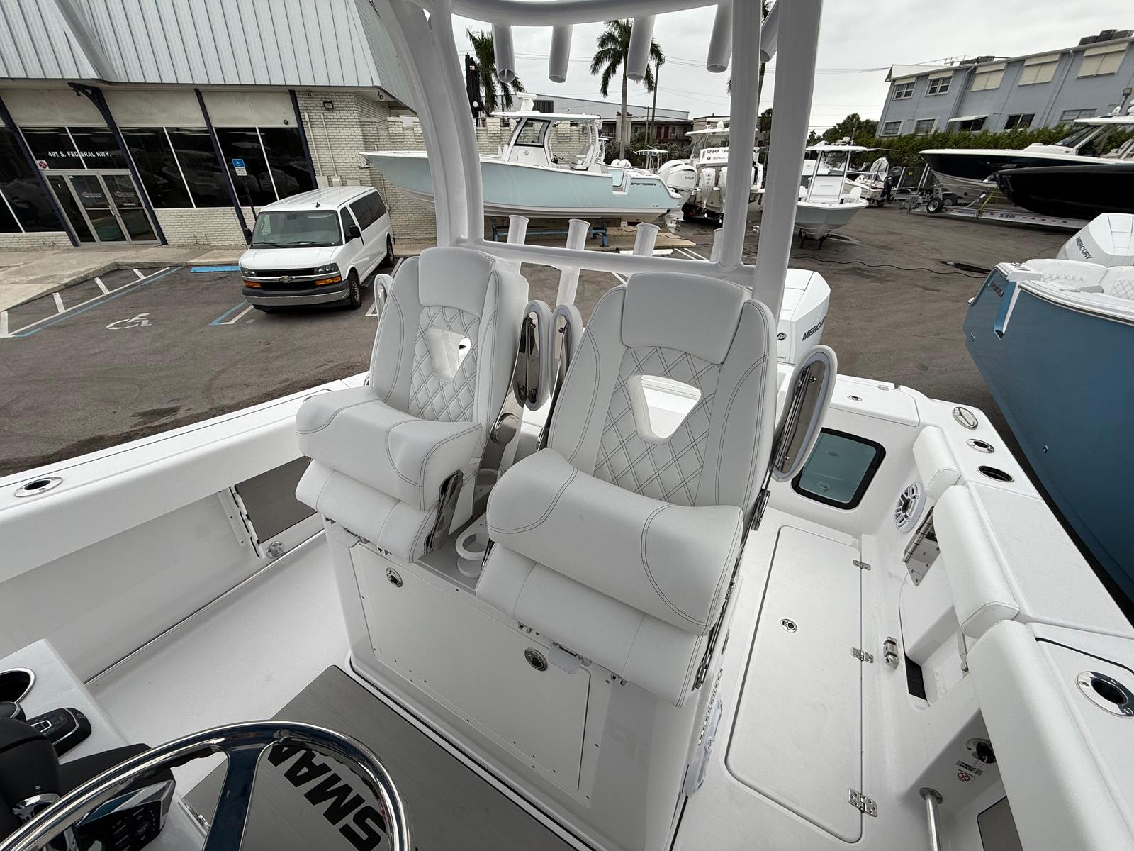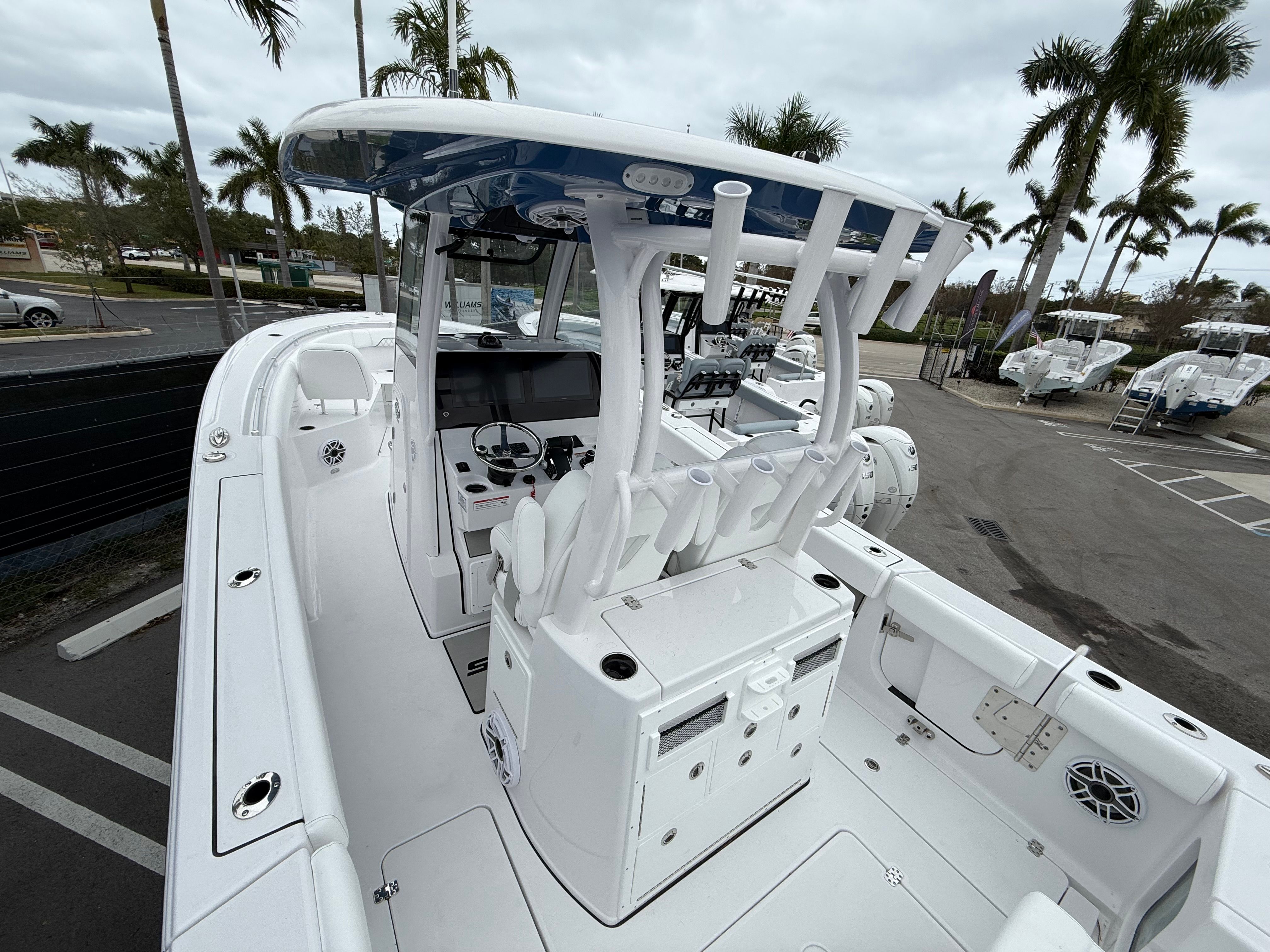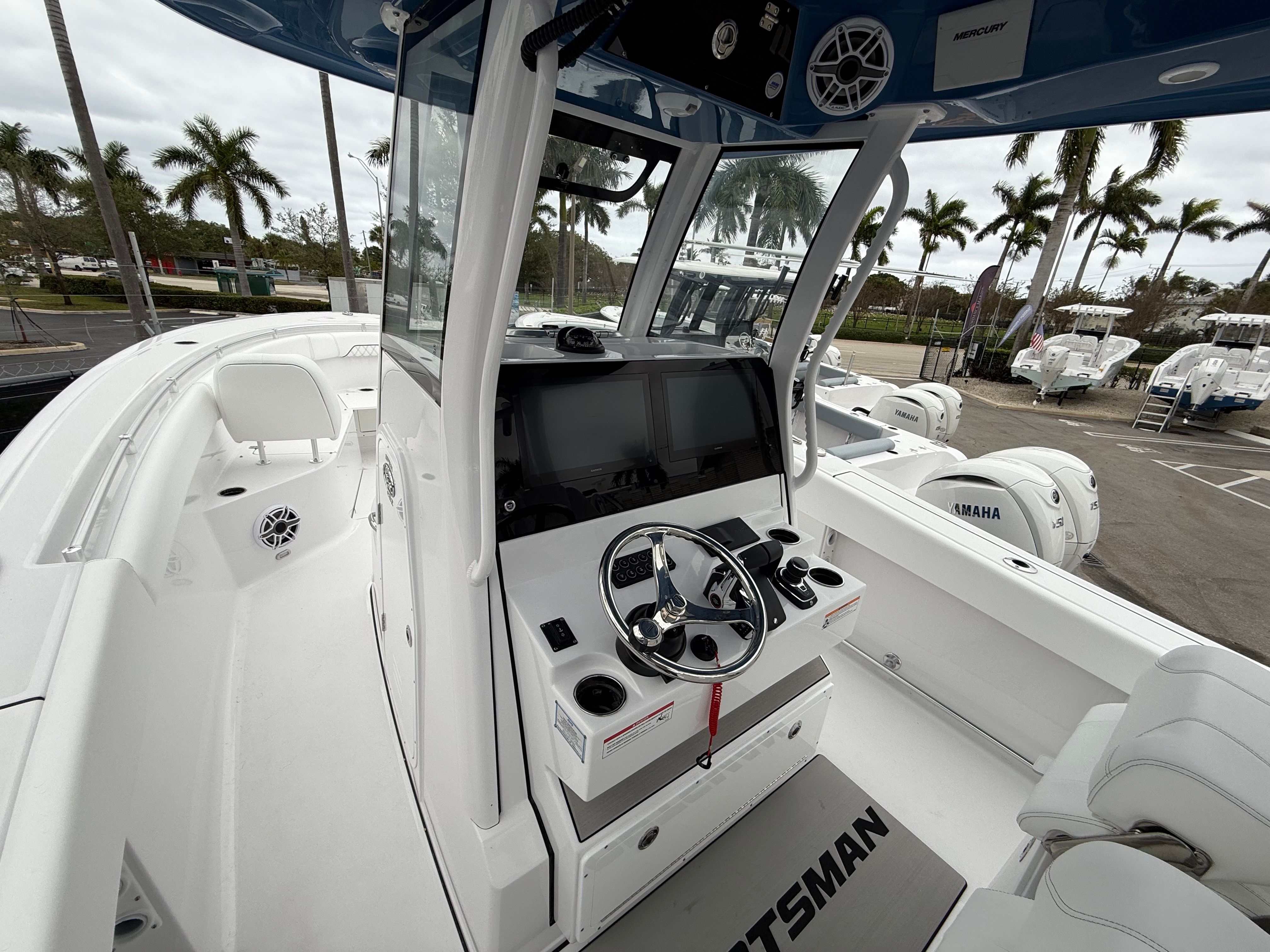 The 2026 Sportsman Open 282 is loaded with premium features that cater to both serious anglers and those seeking leisurely days on the water. The fiberglass console, complete with a fiberglass liner and cooler seat, provides a durable and functional command center. Overhead, the fiberglass hard top with integrated LED lighting not only adds to the boat’s modern aesthetic but also ensures visibility and comfort during evening cruises or early morning fishing trips. The hardtop’s underside, finished in Explorer Blue, complements the hull and adds a custom touch.The white powder coating throughout the boat enhances durability and gives the Open 282 a clean, sophisticated look. The Serenity Sileather Icecap White upholstery offers plush, weather-resistant seating, ensuring comfort for you and your guests during long days on the water. The fiberglass leaning post is equipped with a tackle center and sink, making it easy to prepare bait or clean up after a successful day of fishing.For navigation and entertainment, the Open 282 features two Garmin 16-inch GPS screens with built-in Wi-Fi, providing state-of-the-art chart plotting, fish finding, and connectivity. The Edson 13-inch stainless steel comfort grip steering wheel with PowerKnob ensures precise control and effortless maneuvering, even in challenging conditions.
