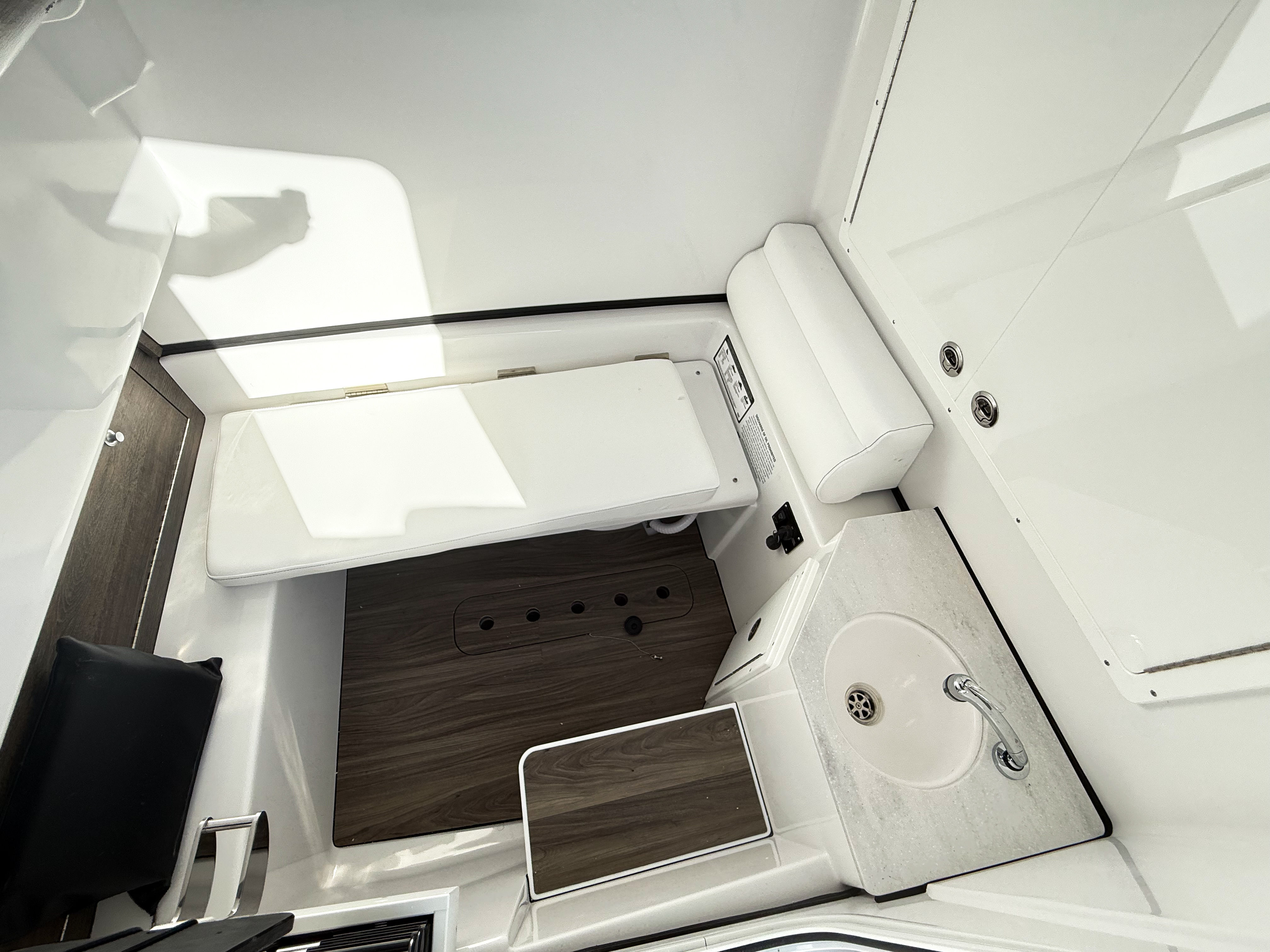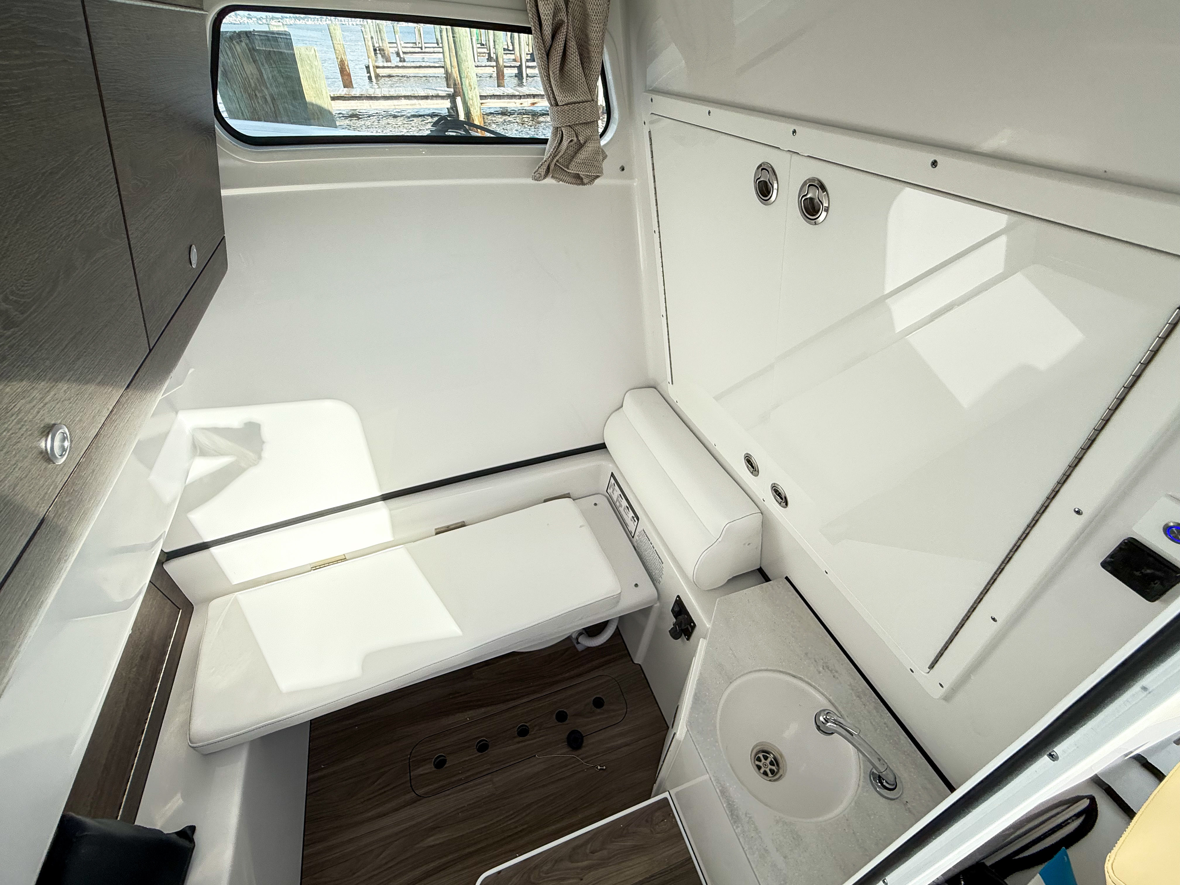The Sportsman Open 322 is packed with features designed to enhance your boating experience. The Edson 13” stainless steel Comfort Grip steering wheel with PowerKnob provides precise control and effortless maneuverability, even in challenging conditions. The Mastervolt ChargeMaster Plus 50 Amp battery charger ensures your onboard electronics and systems remain powered throughout your journey, while the Seakeeper 2 gyroscopic stabilizer, paired with the required 50A charger, delivers unmatched stability for a smooth ride in choppy waters.For anglers and outdoor enthusiasts, the trolling motor plug, harness, and adapter offer added convenience for fishing excursions. The thoughtful design extends to every detail, from the spacious deck layout to the premium Coastal Beige upholstery, ensuring comfort and functionality for all passengers. The white powder coating not only enhances the boat’s appearance but also provides durability and resistance to the elements.