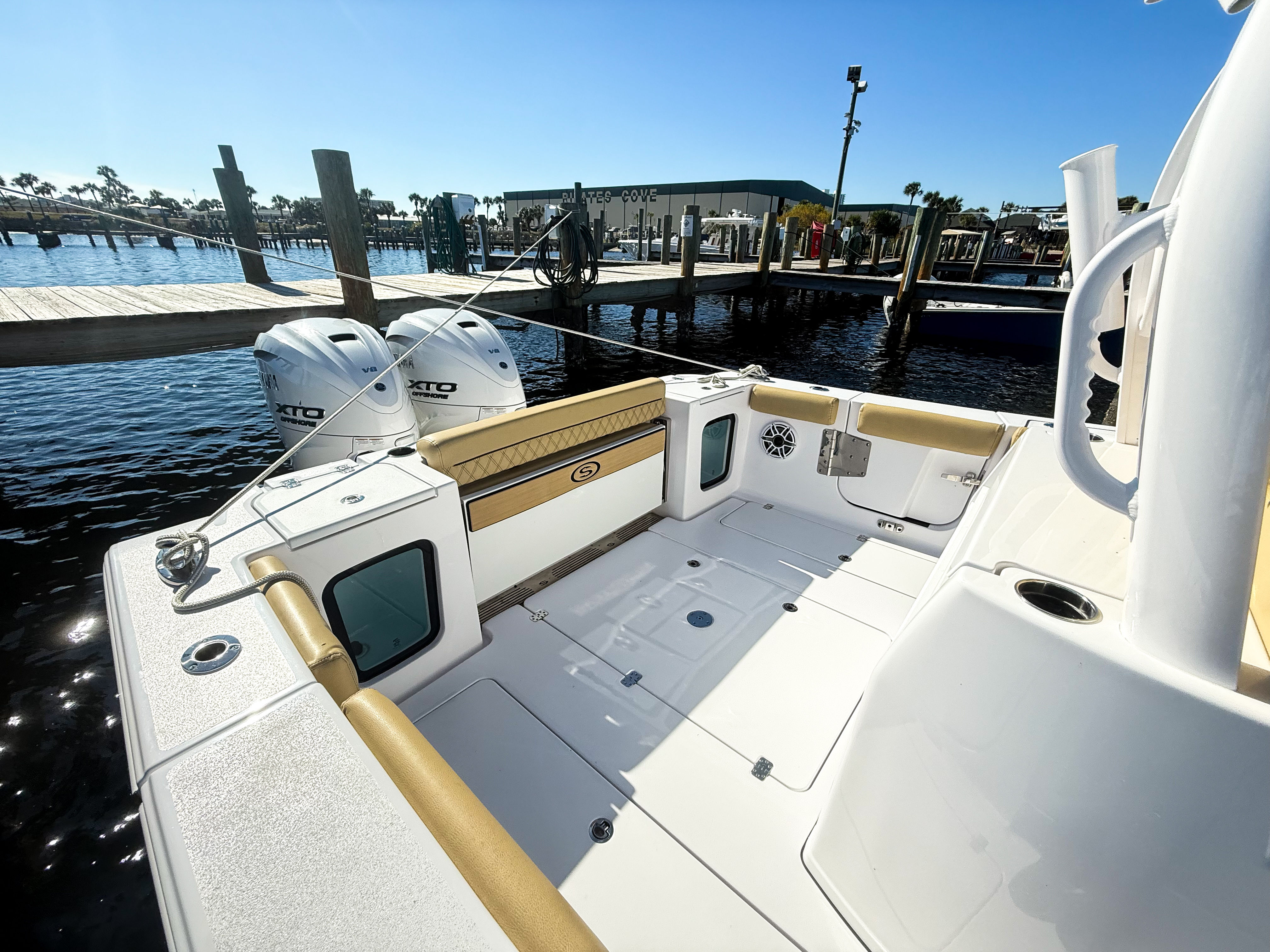 The Sportsman Open 322 is designed with practicality in mind, making ownership as enjoyable as it is rewarding. The intuitive helm layout, featuring dual Garmin displays and the ergonomic Edson steering wheel, puts all essential controls at your fingertips for stress-free navigation. The boat’s size and design make docking straightforward, while the efficient Yamaha engines help keep fuel costs manageable during extended outings. The ample deck space and thoughtful storage solutions ensure you have room for all your gear, whether you are packing fishing equipment, water toys, or picnic supplies. The air conditioning system provides a welcome retreat from the heat, making long days on the water more comfortable for everyone on board.