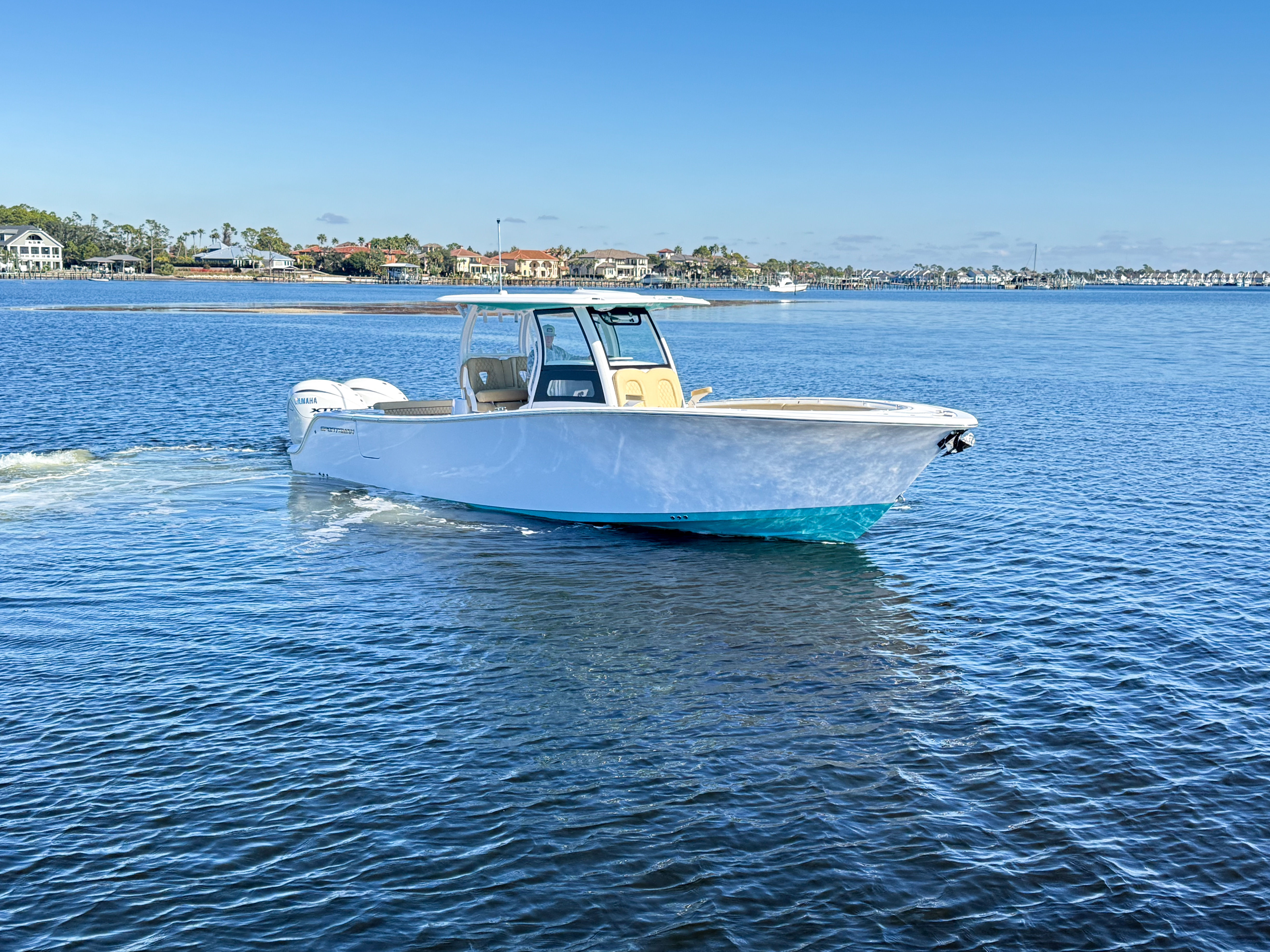 The 2025 Sportsman Open 322 measures an impressive 32.17 feet in length, offering ample space for both relaxation and activity. As a new model, this Center Console boat boasts the latest advancements in marine engineering and design, ensuring you enjoy every moment on the water. The striking Snow White hull sides are complemented by a Sea Glass Green hull bottom and matching HardTop underside, creating a visually stunning presence that stands out at any marina or on open water. The Desert Tan upholstery adds a touch of sophistication and comfort, making every journey a pleasure.