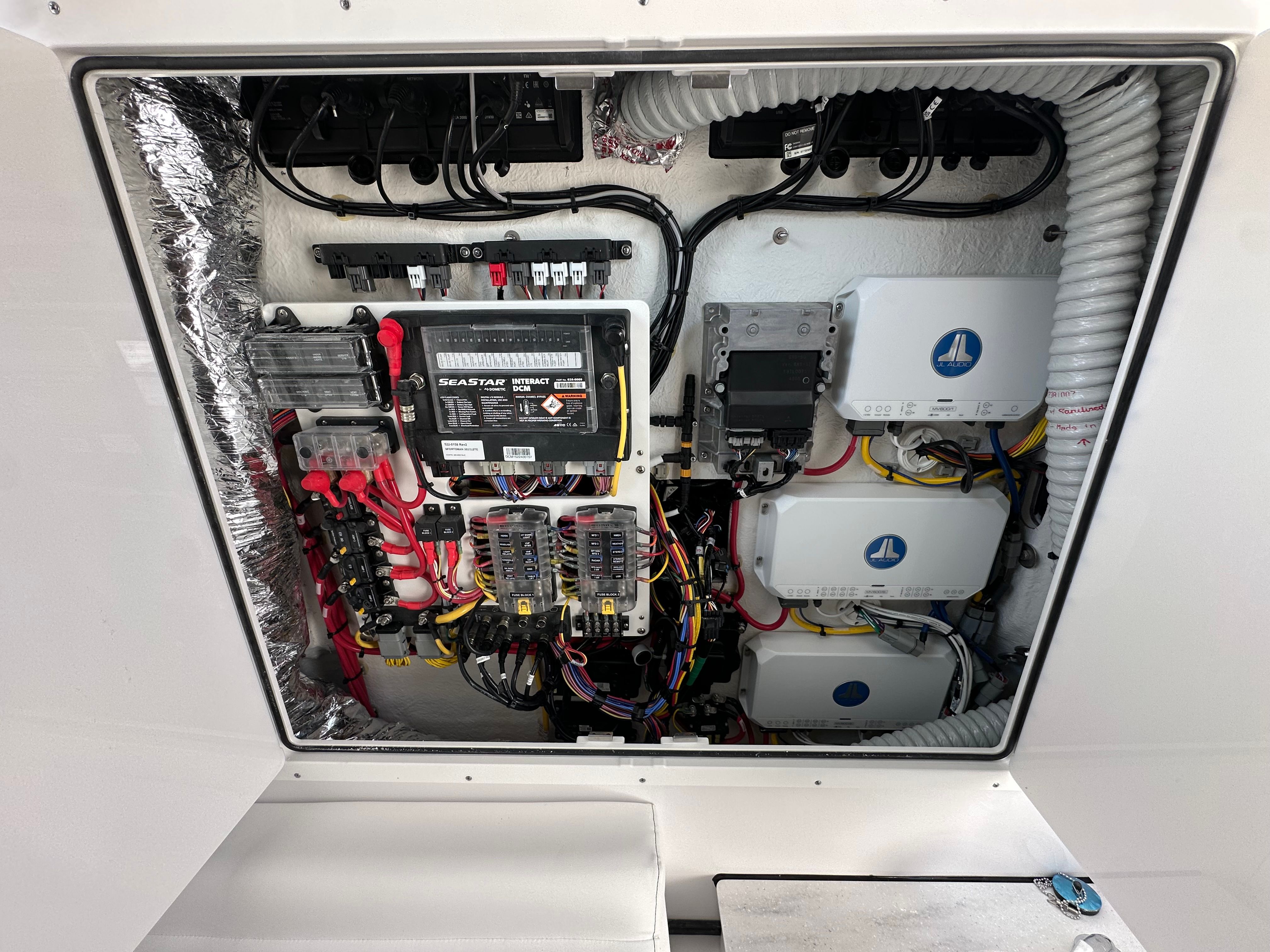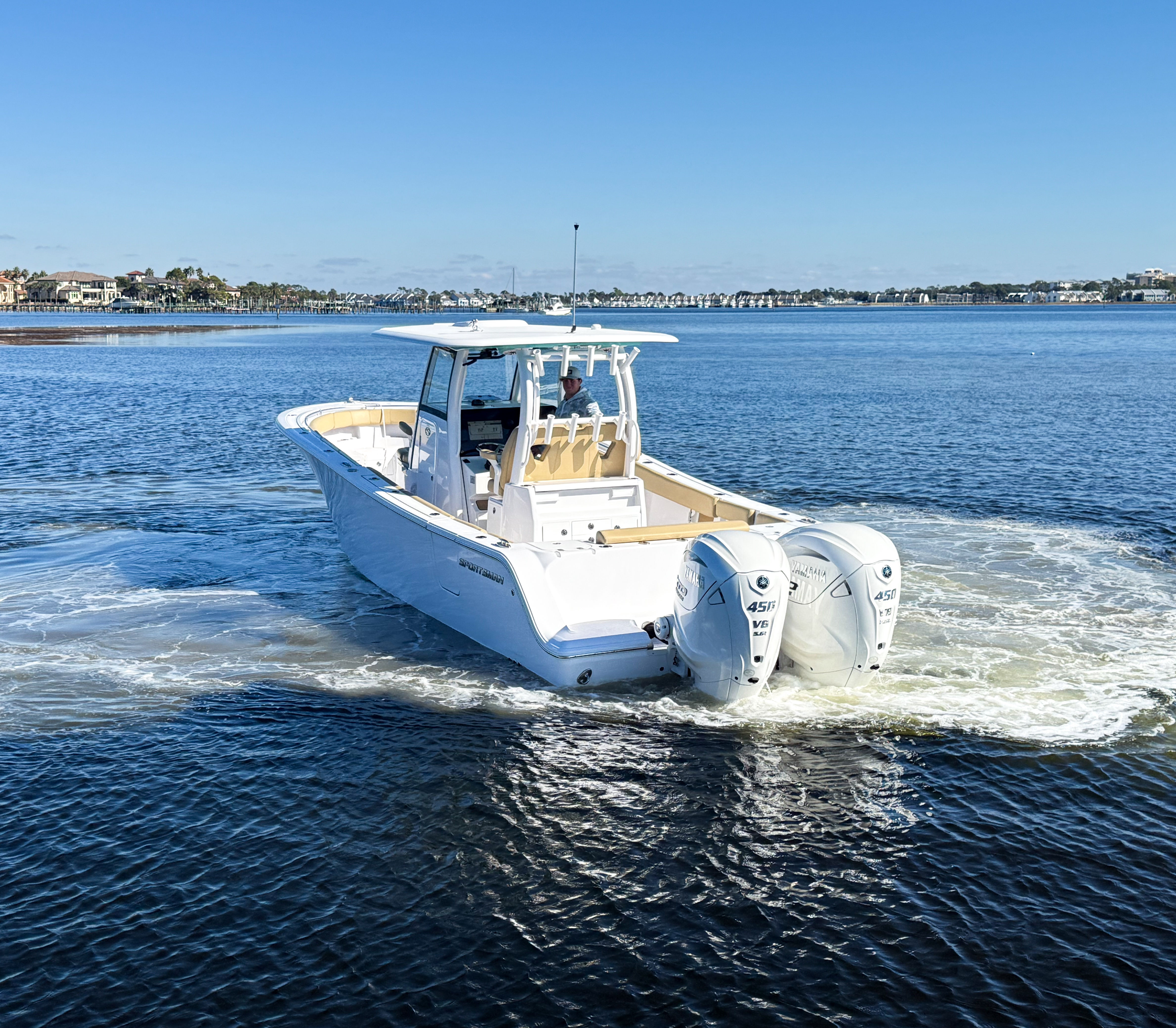 Powering the Sportsman Open 322 are twin Yamaha XF450 engines, finished in sleek white, delivering a combined 900 horsepower. This formidable powertrain ensures exhilarating acceleration, impressive top speeds, and smooth cruising, whether you are navigating coastal waters or heading offshore. The advanced engineering of these Yamaha engines guarantees reliability, fuel efficiency, and low maintenance, allowing you to focus on enjoying your time on the water. The inclusion of the Edson 13” Stainless Steel Comfort Grip Steering Wheel with PowerKnob provides precise handling and effortless maneuverability, making docking and navigating tight spaces a breeze.