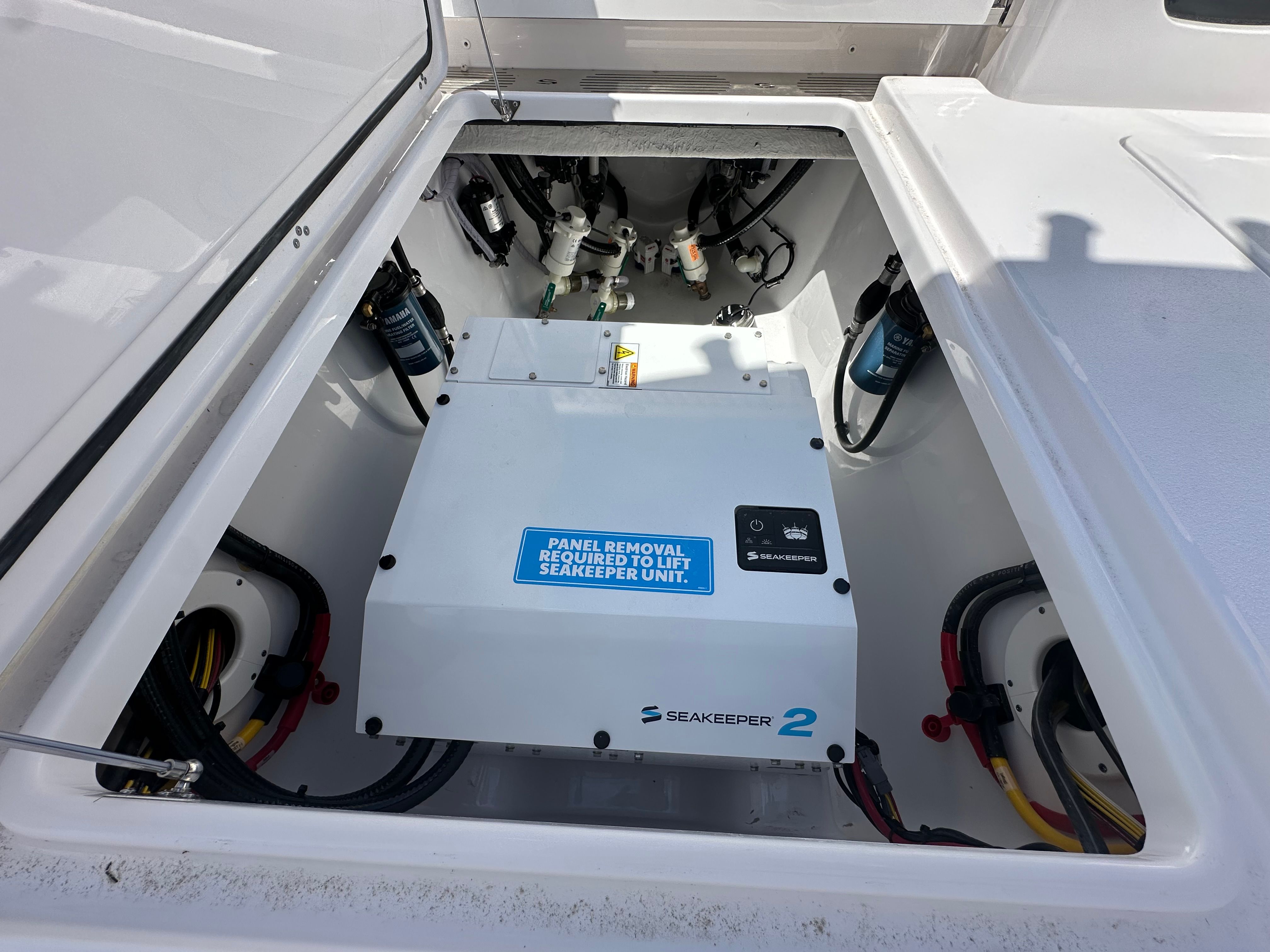 The 2025 Sportsman Open 322 is loaded with premium features designed to enhance your boating experience. The dual Garmin GPSMAP 1643xsv 16" screens offer state-of-the-art navigation and fish-finding capabilities, ensuring you stay on course and maximize your time on the water. The HardTop, with its Sea Glass Green underside, not only adds to the boat’s striking appearance but also provides essential shade and protection from the elements. The Seakeeper 2 Gyroscopic Stabilizer is a game-changer, virtually eliminating boat roll and ensuring a stable, comfortable ride even in choppy conditions. For those hot summer days, the 12V 3500 BTU air conditioning system keeps the interior cool and inviting, allowing you and your guests to relax in total comfort.