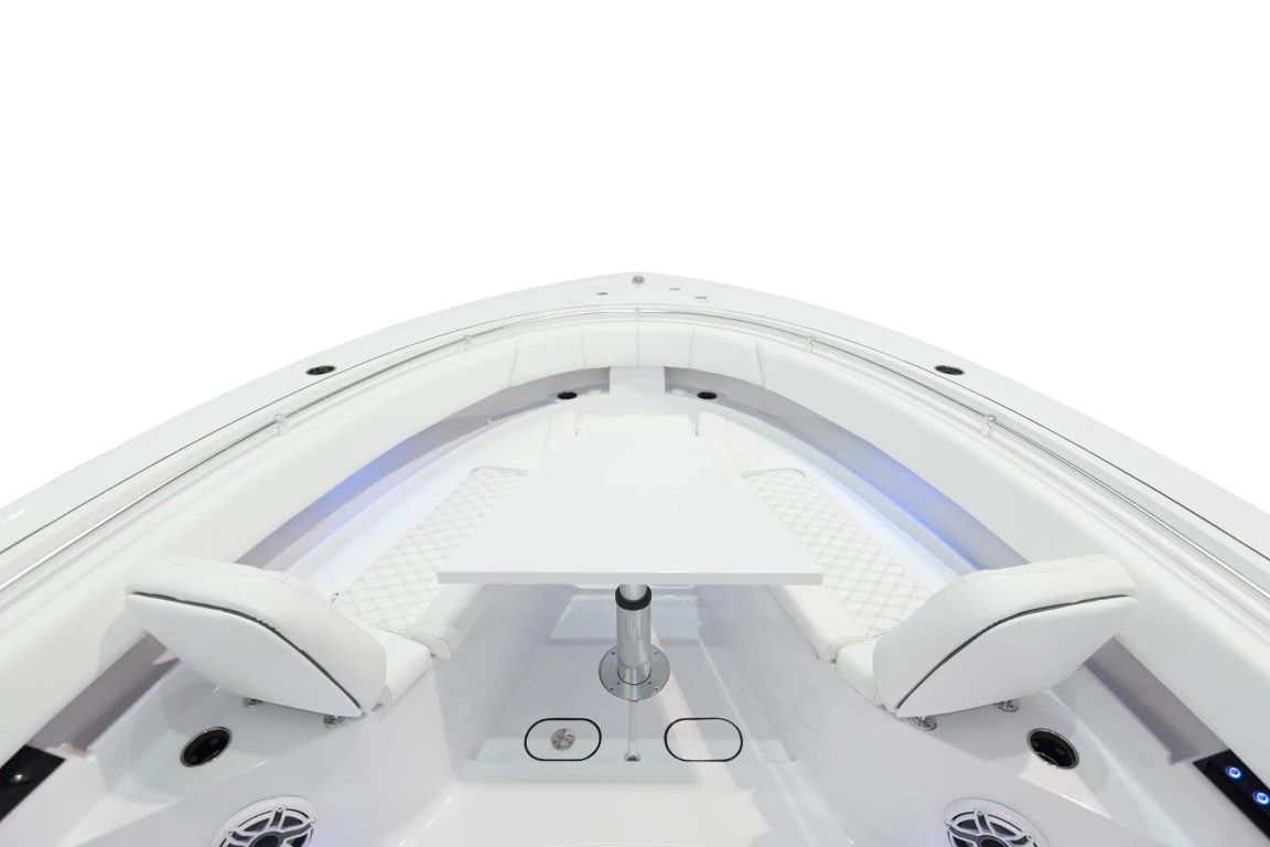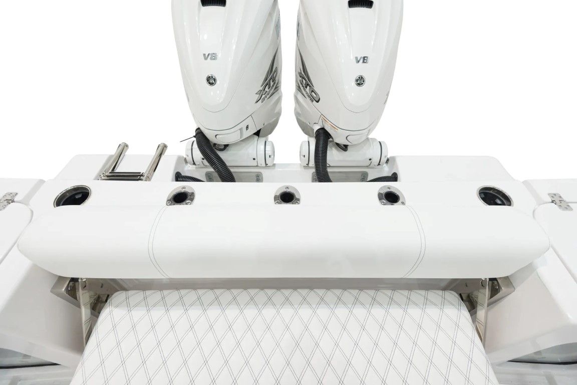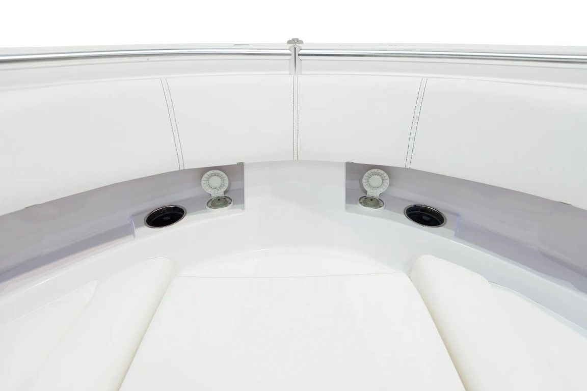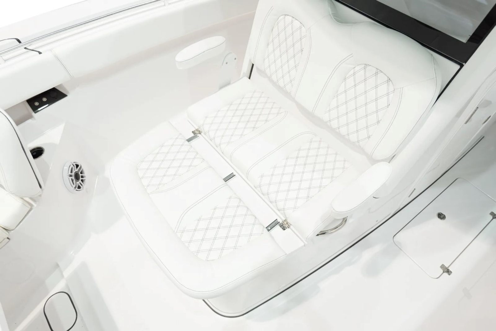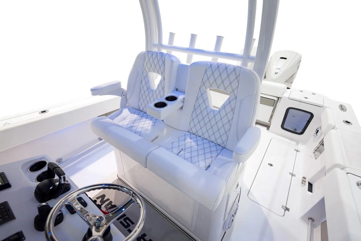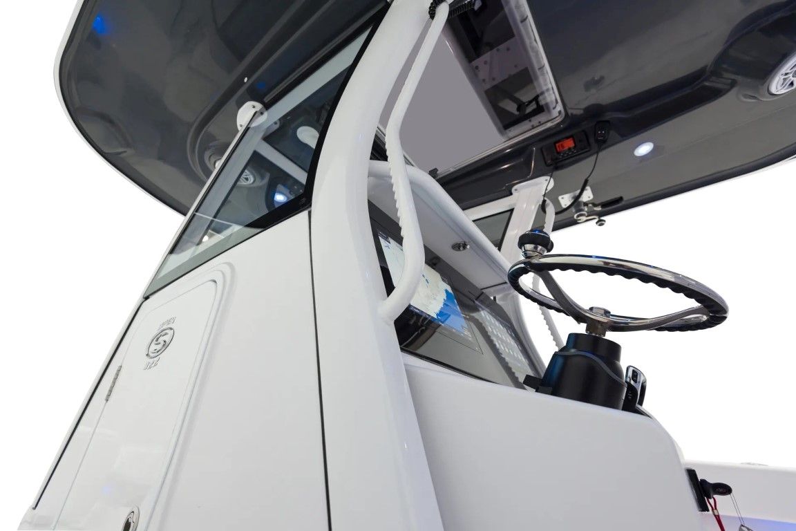 Step aboard the Sportsman Open 322 and discover a world of premium features designed for both comfort and convenience. The hull and bottom are finished in a striking white, complemented by a fiberglass console with an FG liner and a cooler seat for added functionality. The fiberglass hard top with integrated LED lighting not only provides shade and protection but also enhances the boat’s modern aesthetic. The hardtop underside is color-matched in white, creating a seamless and sophisticated look.Attention to detail is evident throughout, with black powder coating on metalwork for a bold, stylish contrast. The Serenity Sileather Smoky Gray upholstery offers a plush, durable seating experience that is both comfortable and easy to maintain. The fiberglass leaning post features a rear-facing seat and a convenient sink, perfect for preparing snacks or cleaning up after a day on the water. The premium 60/40 bench with bolsters ensures that everyone on board enjoys ergonomic support and relaxation, whether you are cruising or anchored at your favorite spot.For navigation and entertainment, the Sportsman Open 322 is equipped with two Garmin 16-inch GPS screens featuring built-in Wi-Fi. These state-of-the-art displays provide intuitive control, real-time navigation, and seamless connectivity, keeping you informed and in command wherever your adventures take you.