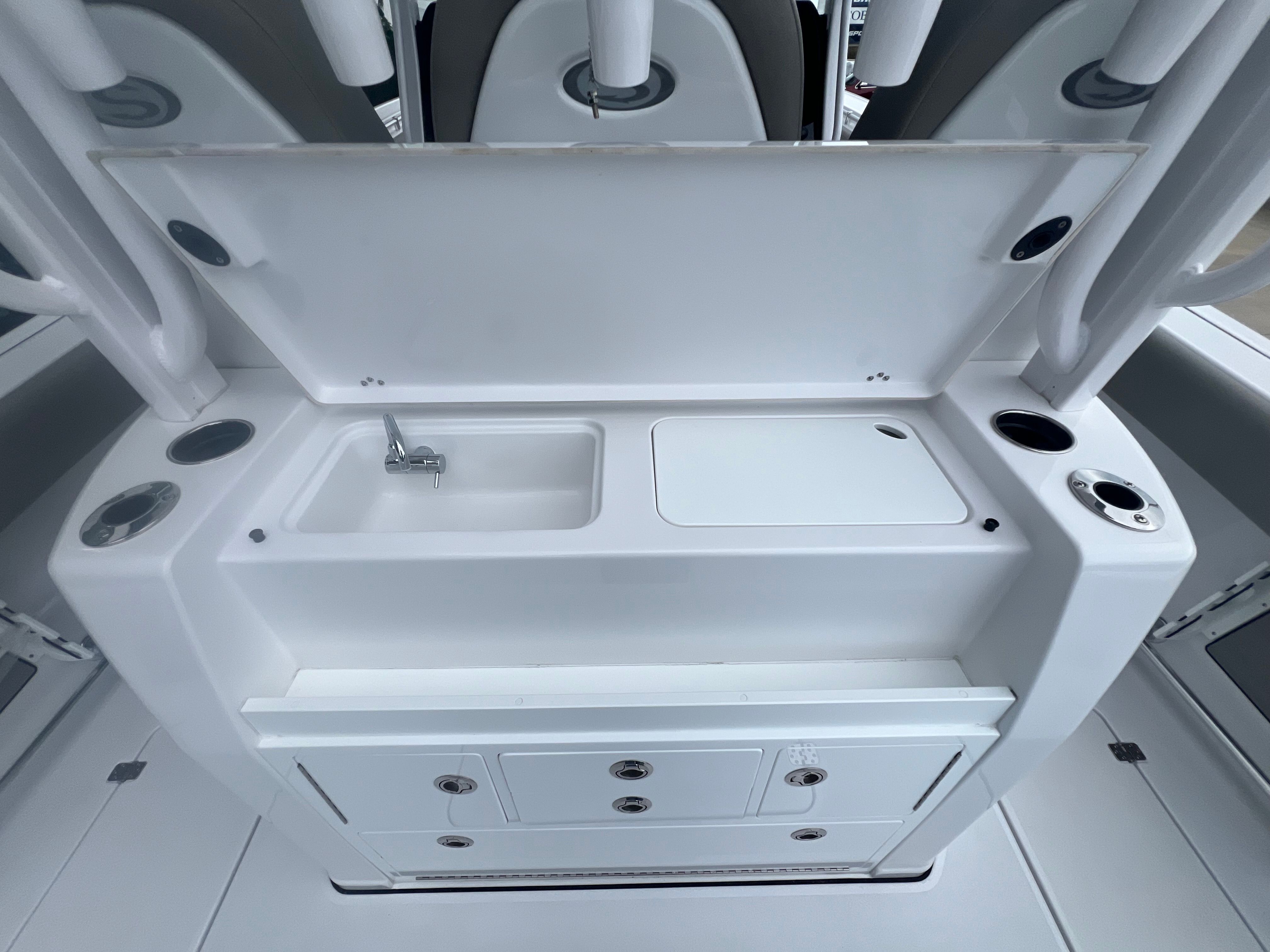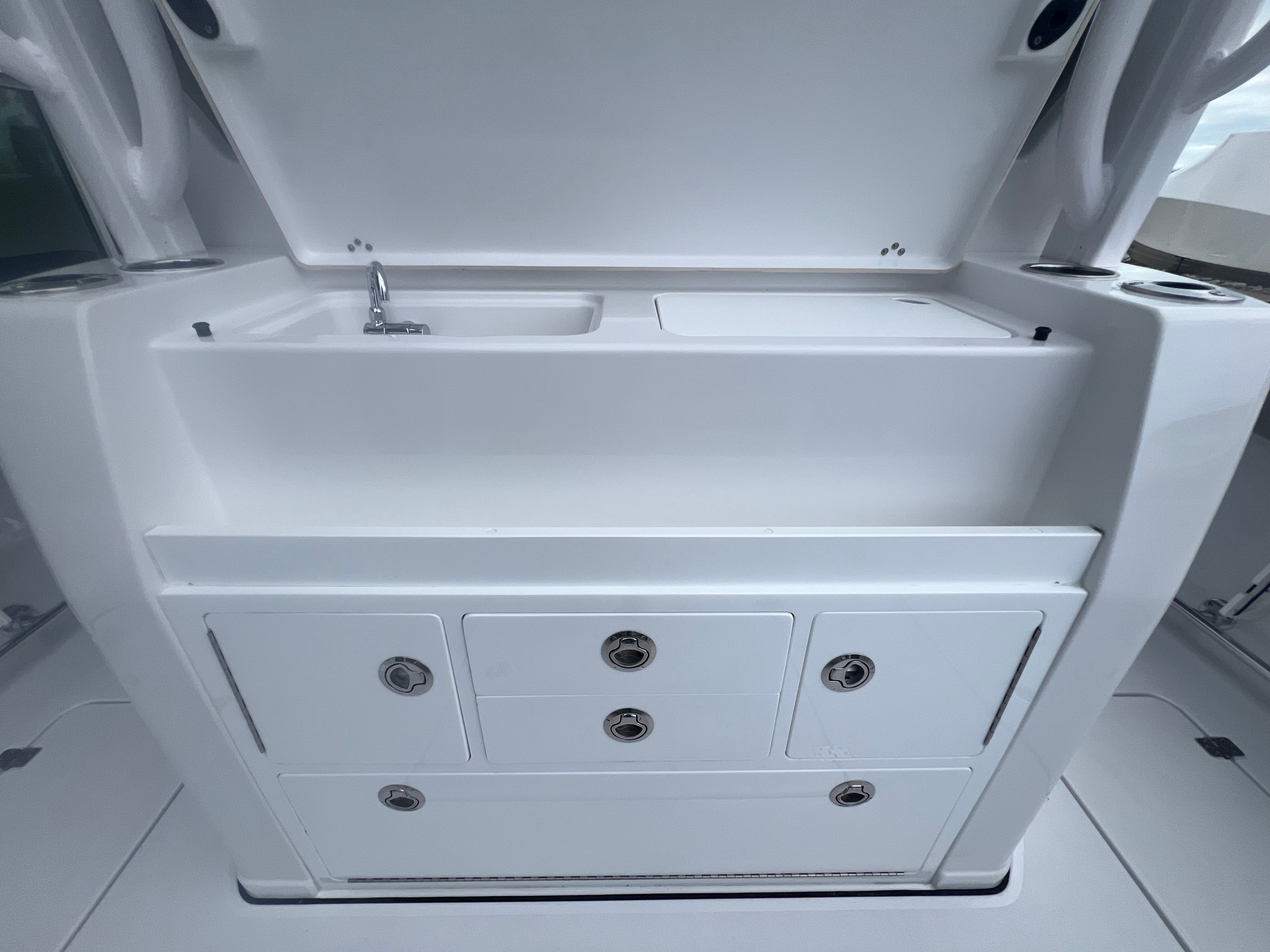 The Sportsman Open 352 is as practical as it is luxurious. Its generous storage options allow you to stow gear, tackle, and personal items securely, keeping the deck clutter-free and organized. The fiberglass leaning post with tackle center and sink streamlines your fishing setup, making it easy to prepare bait and clean up after a successful day on the water. Docking is simplified by the boat’s agile handling and responsive controls, while the efficient Mercury engines help you make the most of every fuel dollar.Whether you’re planning a weekend getaway, a day of offshore fishing, or a relaxing cruise with loved ones, the Open 352 adapts to your needs. Its spacious layout and thoughtful amenities ensure every outing is enjoyable and stress-free, while the durable construction and premium finishes guarantee lasting value and low maintenance.