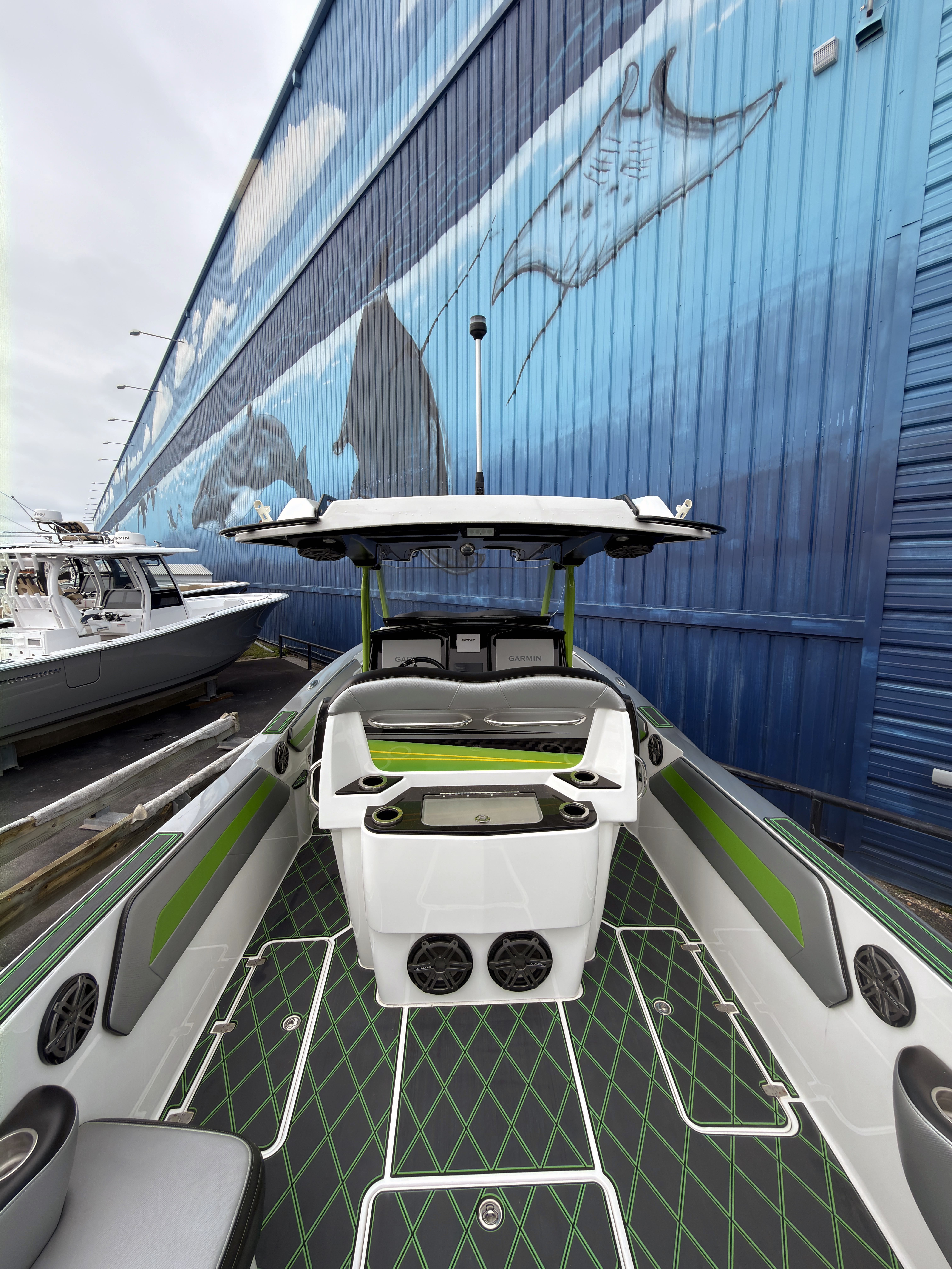 Prepare to turn heads everywhere you go with this stunning 2020 Sunsation 32 CCX. Finished in a custom, high-impact lime green and black graphics package, this boat is the perfect fusion of exhilarating performance and center console versatility. With only 133 hours on its twin Mercury Racing 450R engines, this vessel is barely broken in and presents in immaculate condition.