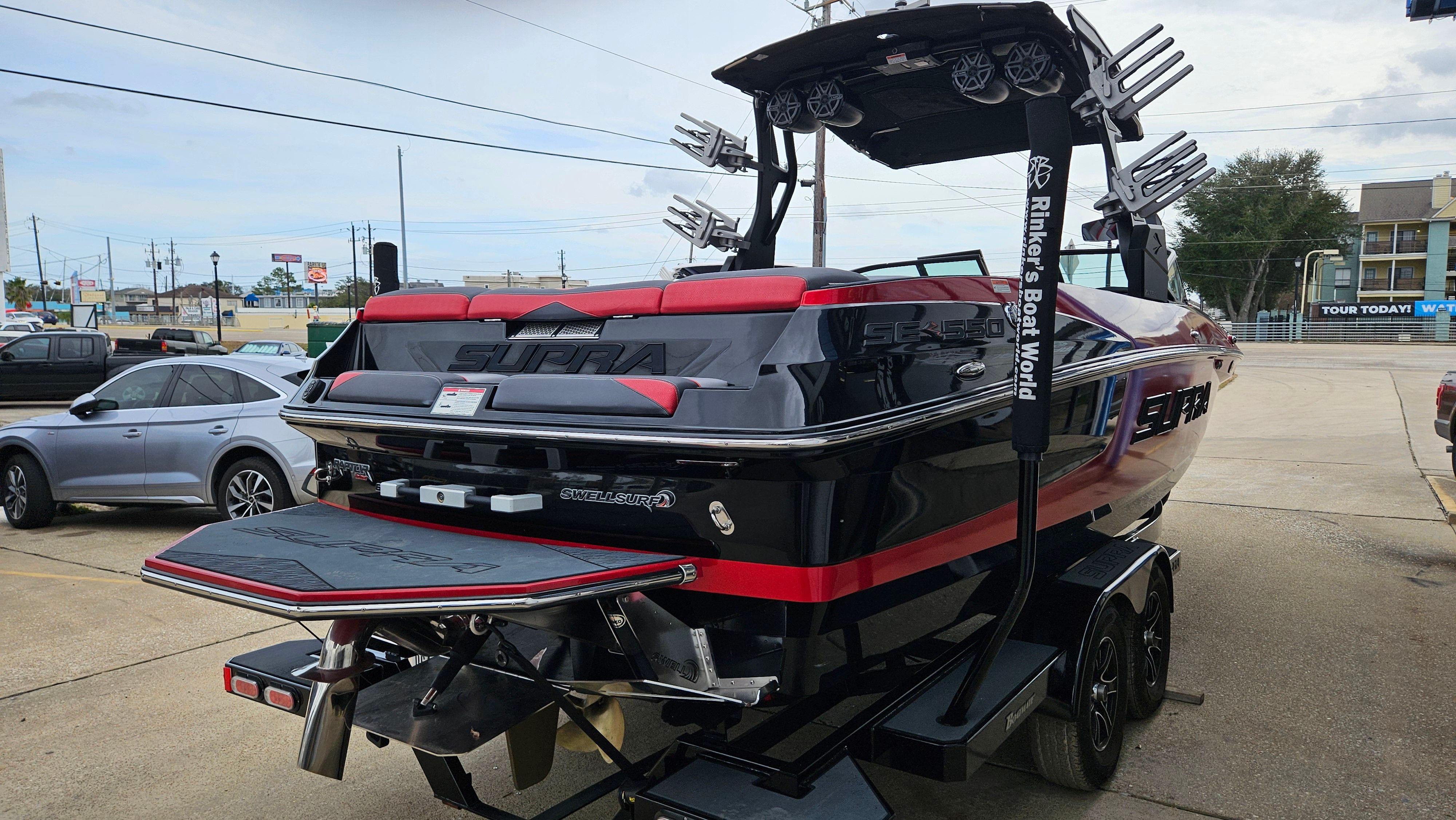 The 2018 Supra SE 550 is loaded with features designed to enhance your time on the water. The Ballast/Surf Package allows you to customize your wake for surfing or wakeboarding, ensuring every rider gets the perfect wave. The Bimini provides shade and comfort during sunny days, while the Bluetooth Stereo lets you set the soundtrack for your adventures. A durable Cover helps protect your investment when not in use, and the Fold Down Wake Tower offers flexibility for storage and transport. The Surf Pipe optimizes exhaust flow for a cleaner ride, and the Tandem Axle Trailer with Swing Tongue makes towing and launching a breeze. Trim Tabs allow for fine-tuning of your ride, and Underwater Lights add a touch of elegance and visibility for evening outings. The Wake Tower is engineered for strength and style, making it easy to attach boards and accessories.