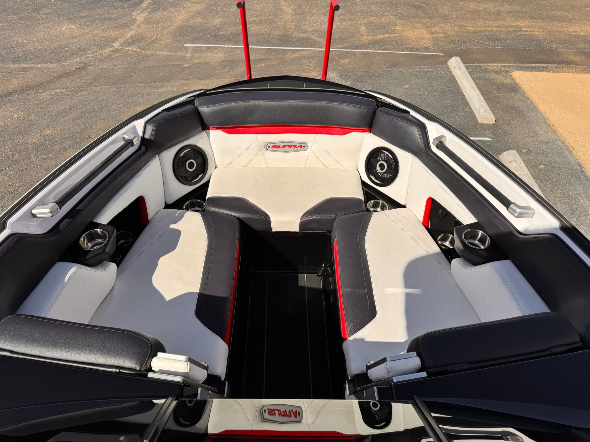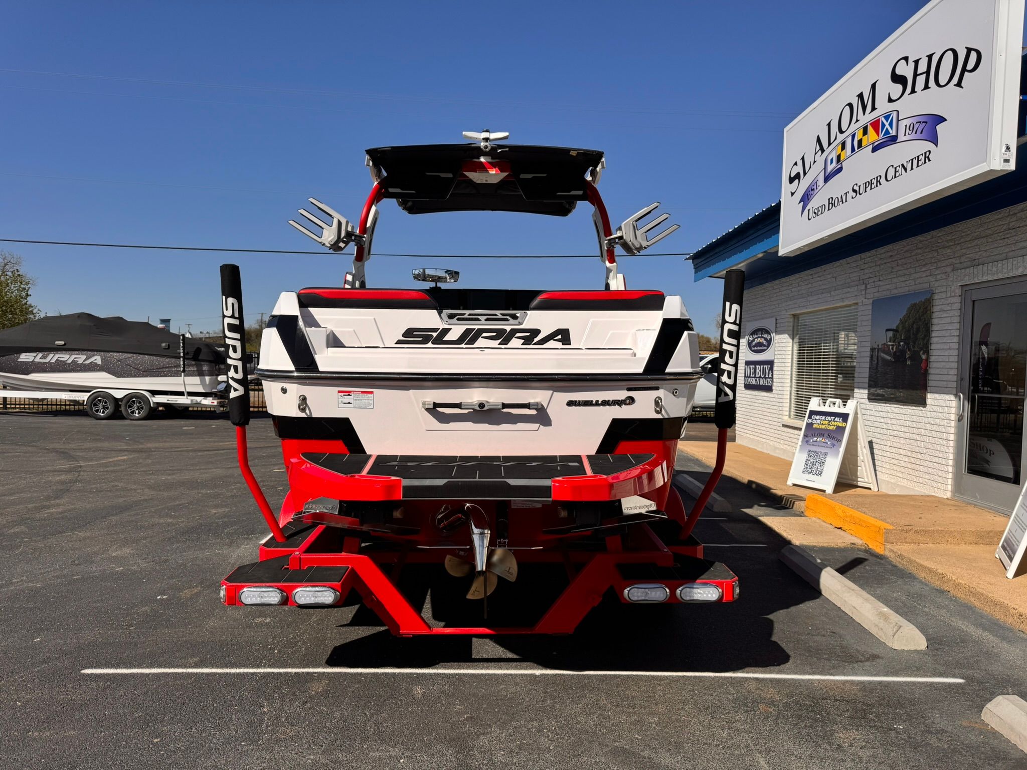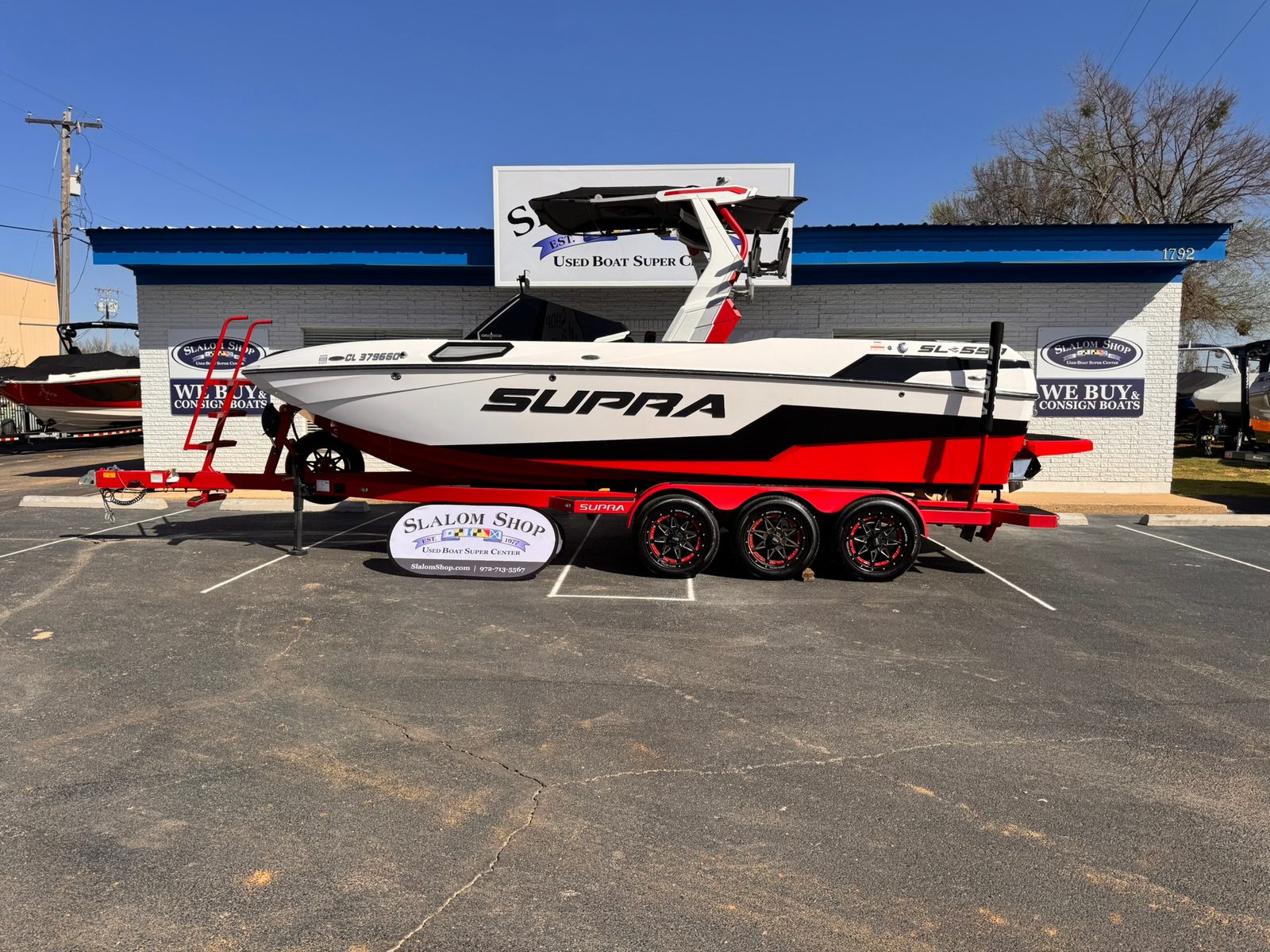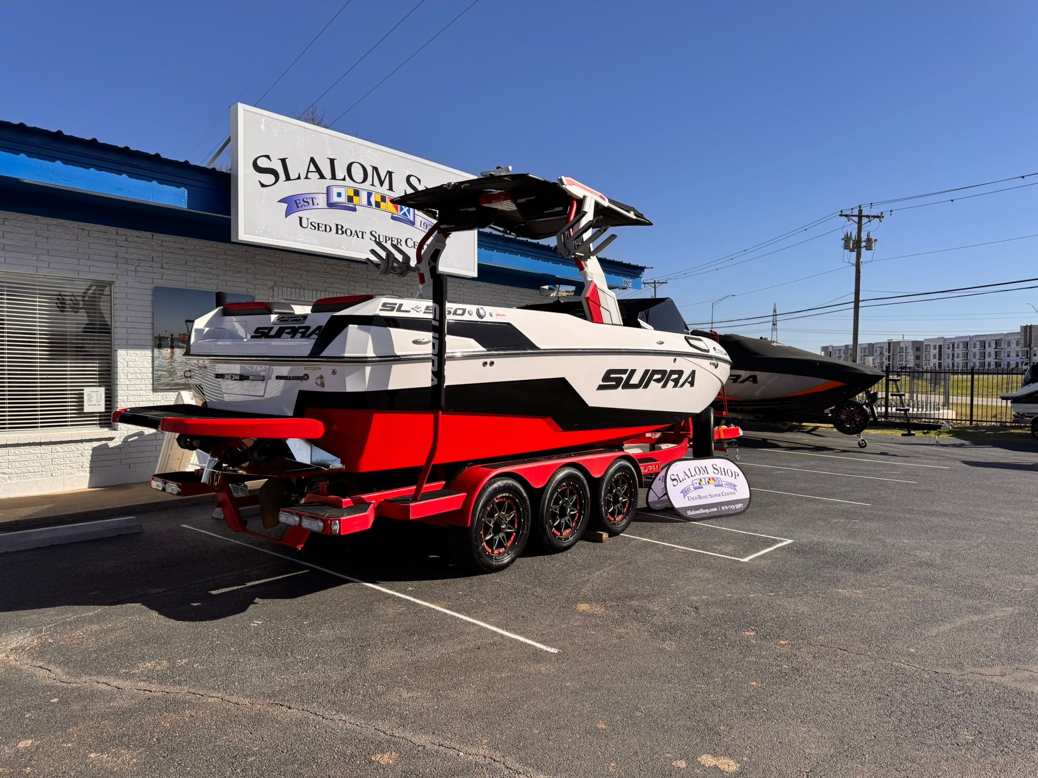 Now available at our Used Boat Super Center in Lewisville, this 2024 Supra SL 550 is a top-tier performance surf boat built for serious riders and luxury on the water. Finished in a bold white, black, and red gelcoat with a white and black interior, this SL is powered by the Indmar 6.2L Supercharged Roush V8 producing 575 horsepower with 183 hours.