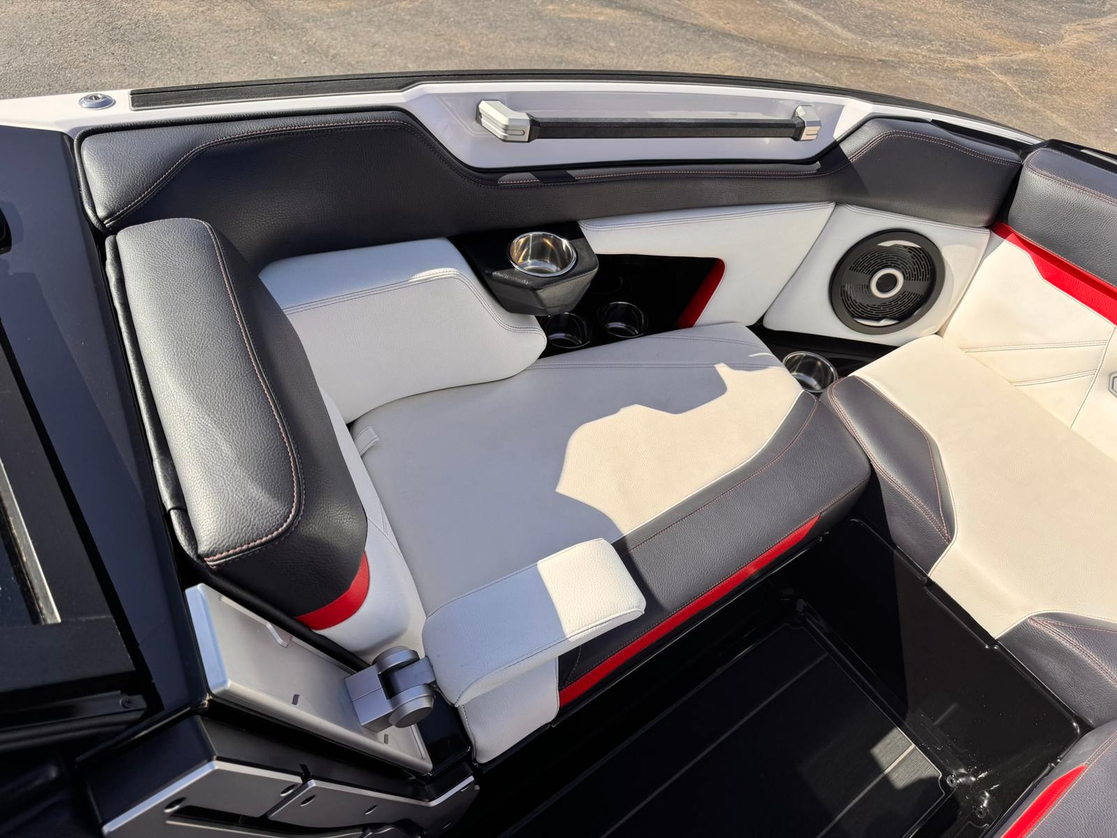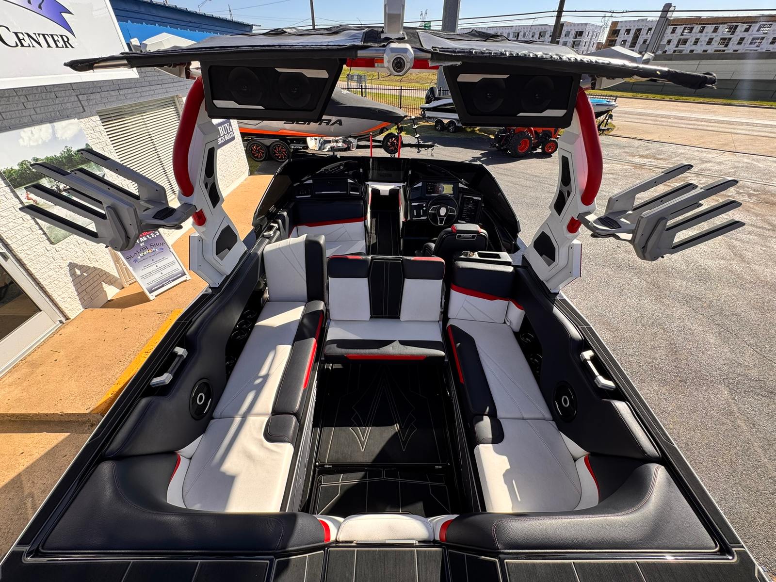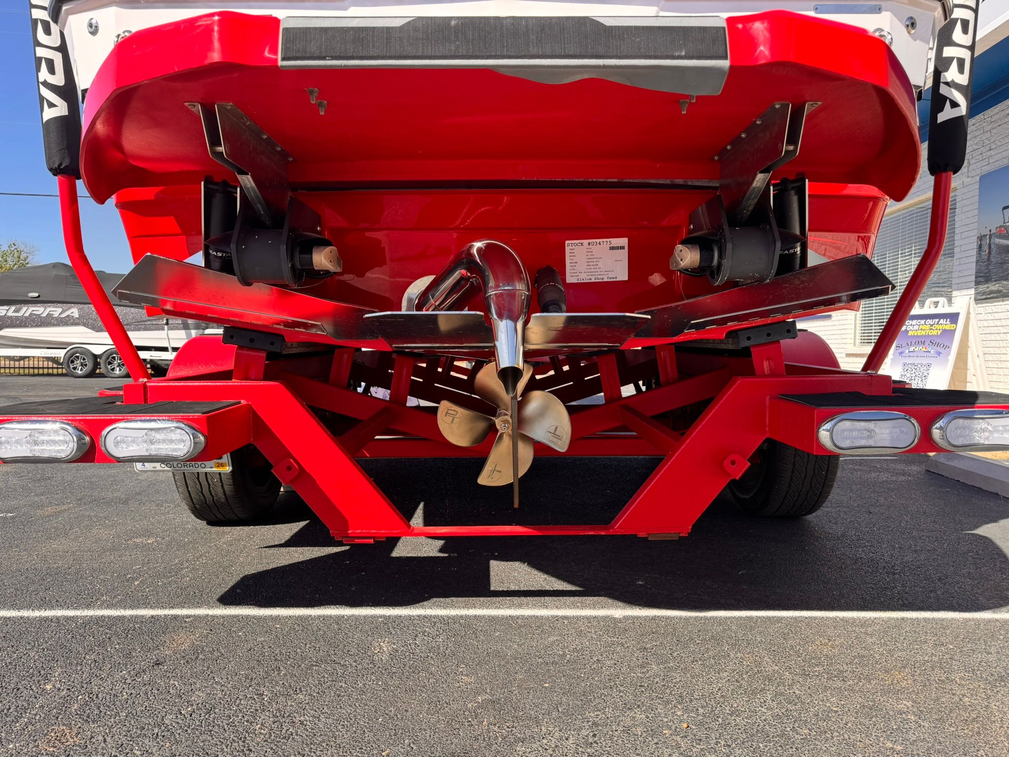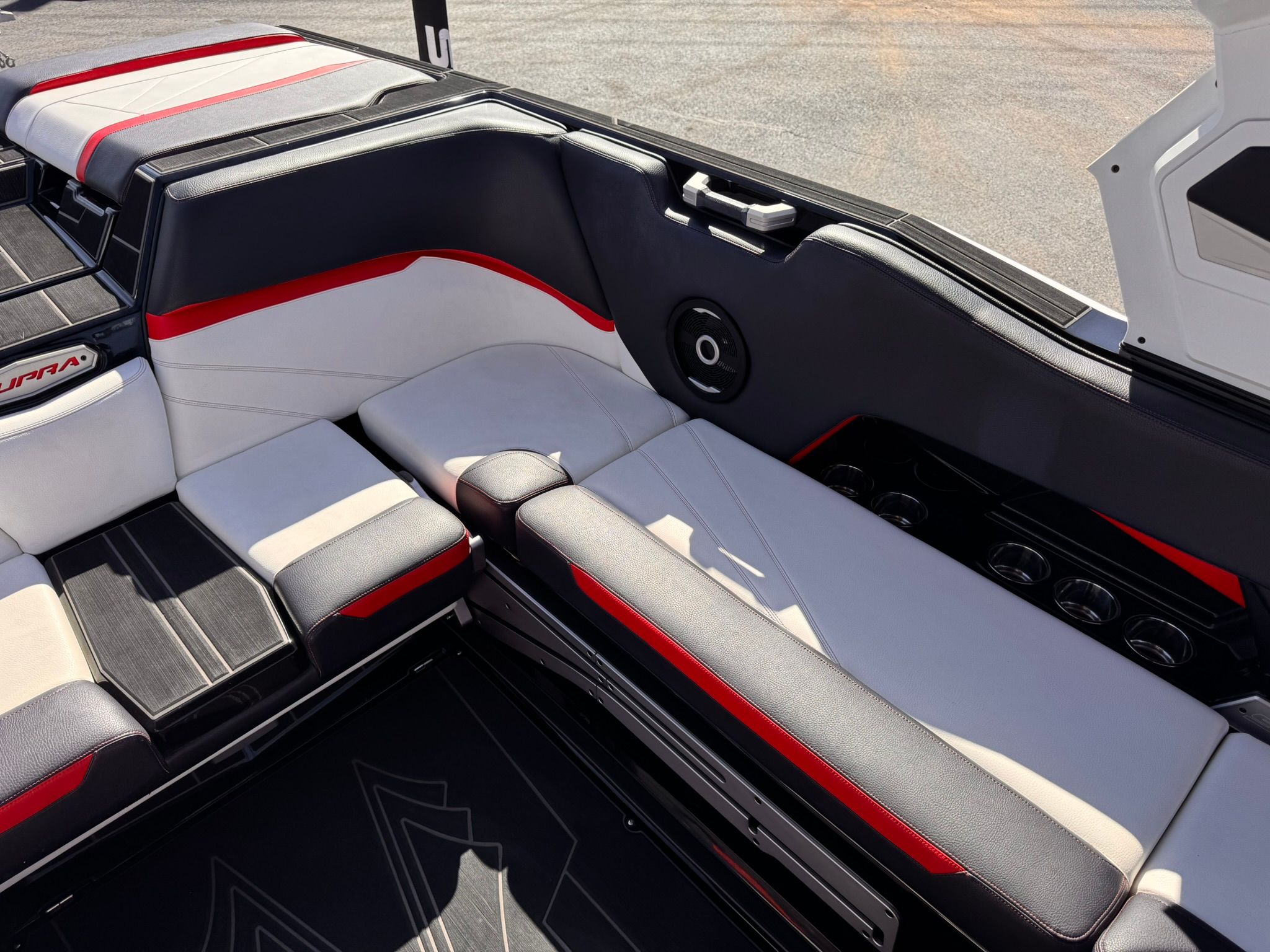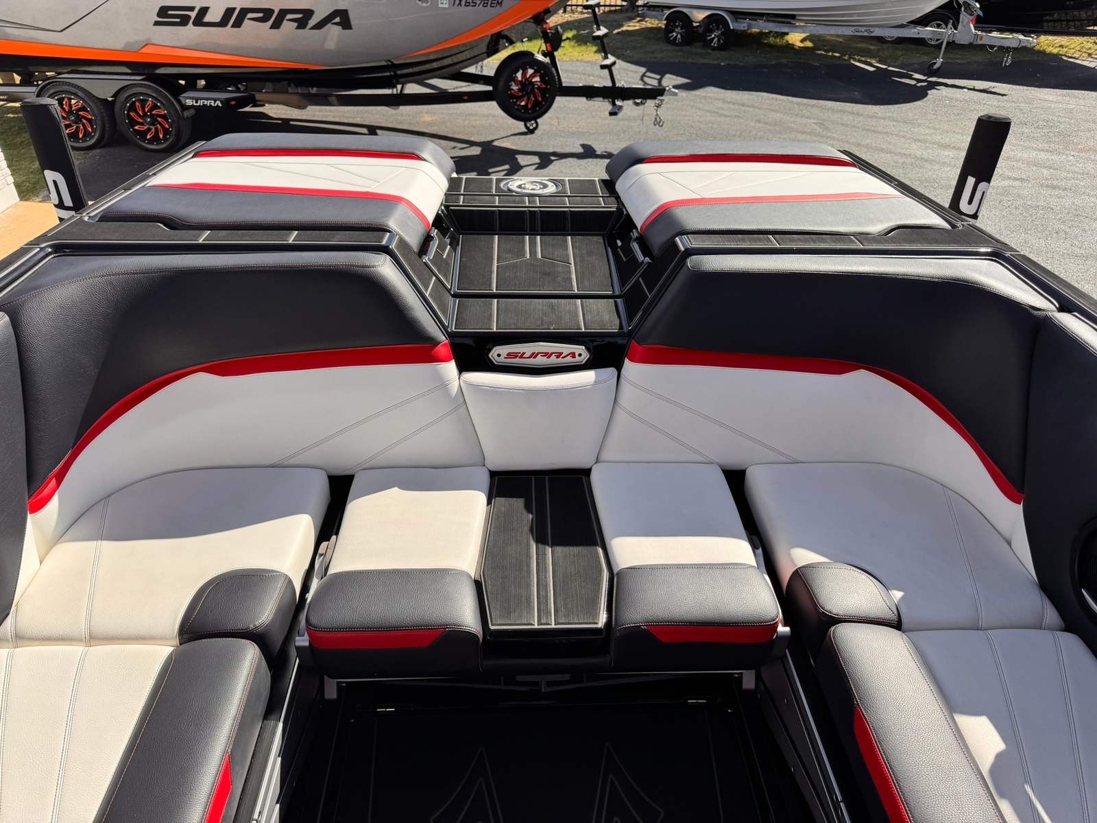 Now available at our Used Boat Super Center in Lewisville, this 2024 Supra SL 550 is a top-tier performance surf boat built for serious riders and luxury on the water. Finished in a bold white, black, and red gelcoat with a white and black interior, this SL is powered by the Indmar 6.2L Supercharged Roush V8 producing 575 horsepower with 183 hours.