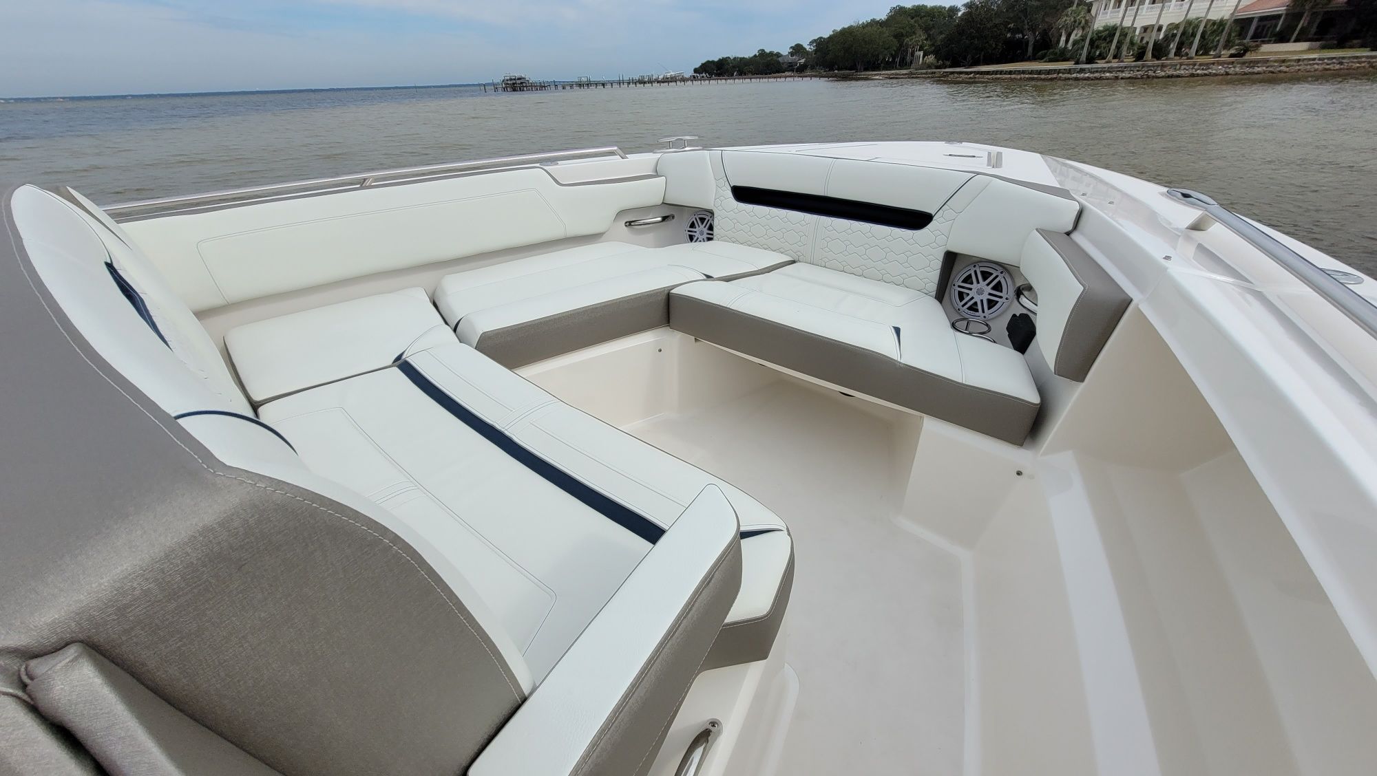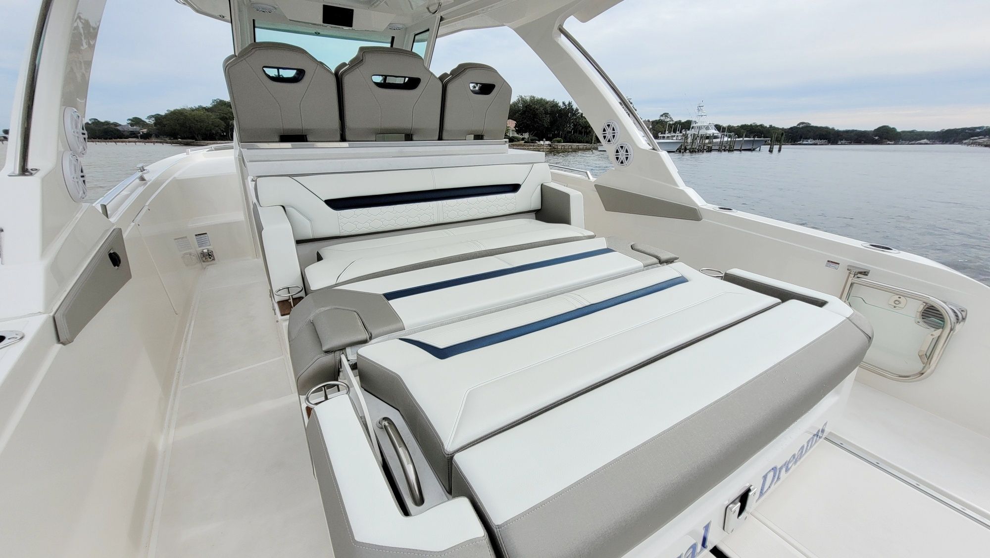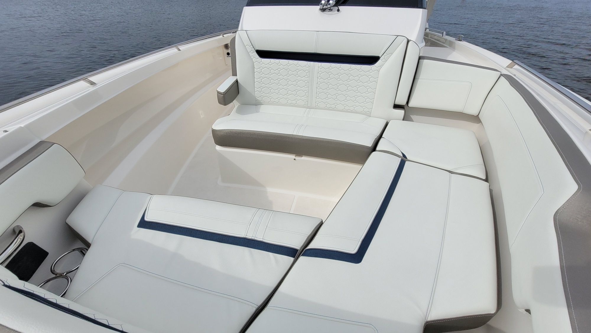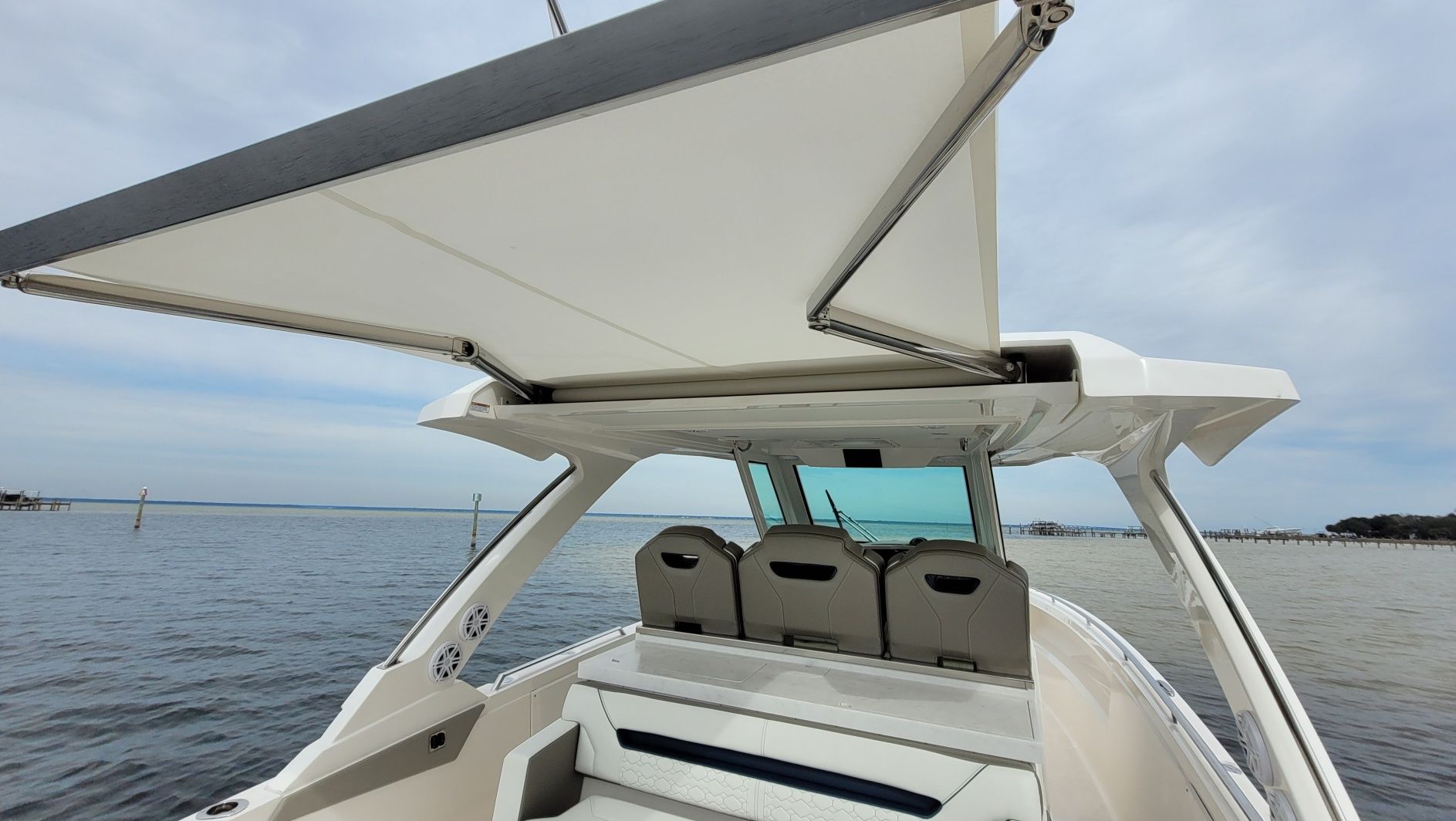 Other notable options include, Panda diesel generator 5KW, water heater, cockpit grill, cockpit TV, Drop curtain enclosure, dramatic lighting package, cool helm air and heat 6k, head macerator system, custom freshwater flush system for the generator and AC unit and custom Yeti cooler storage.