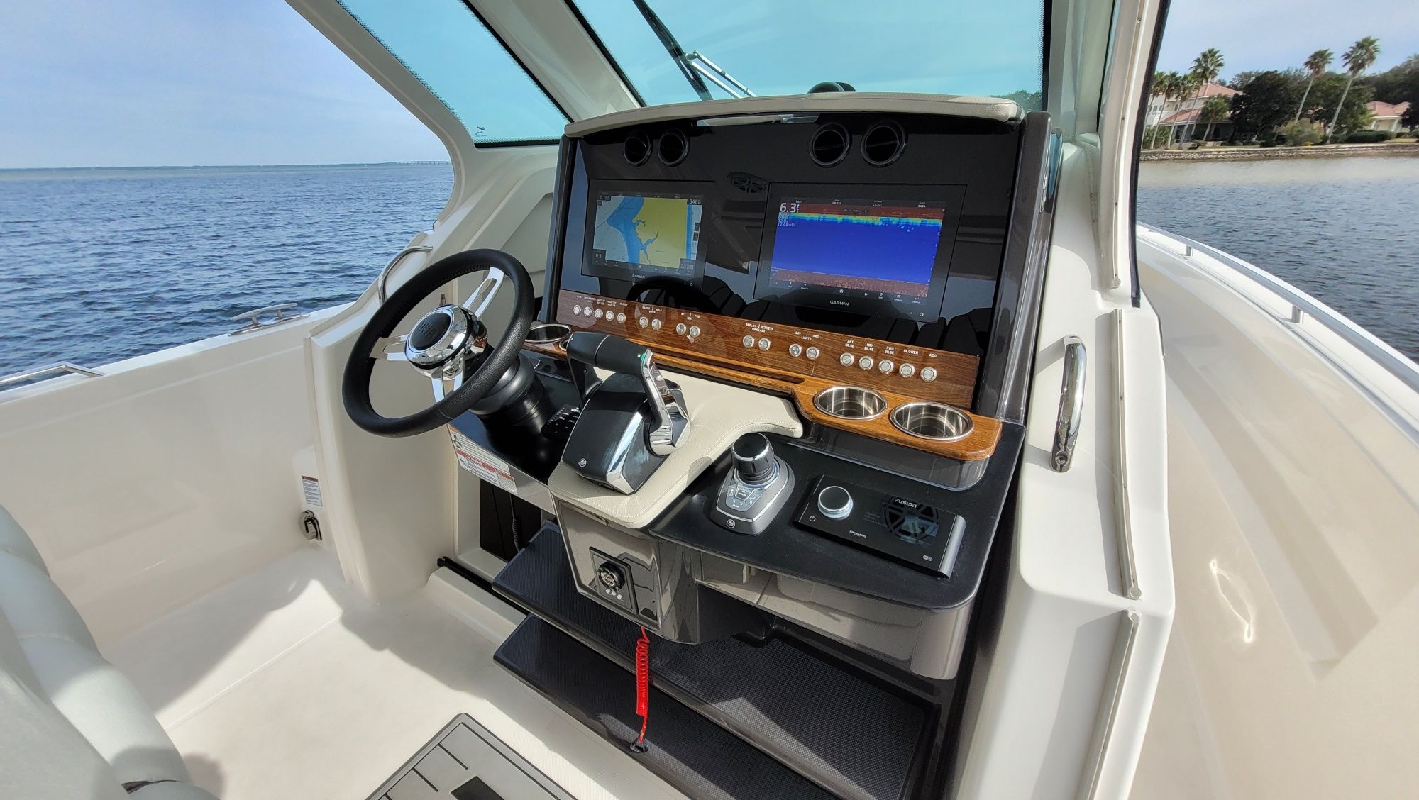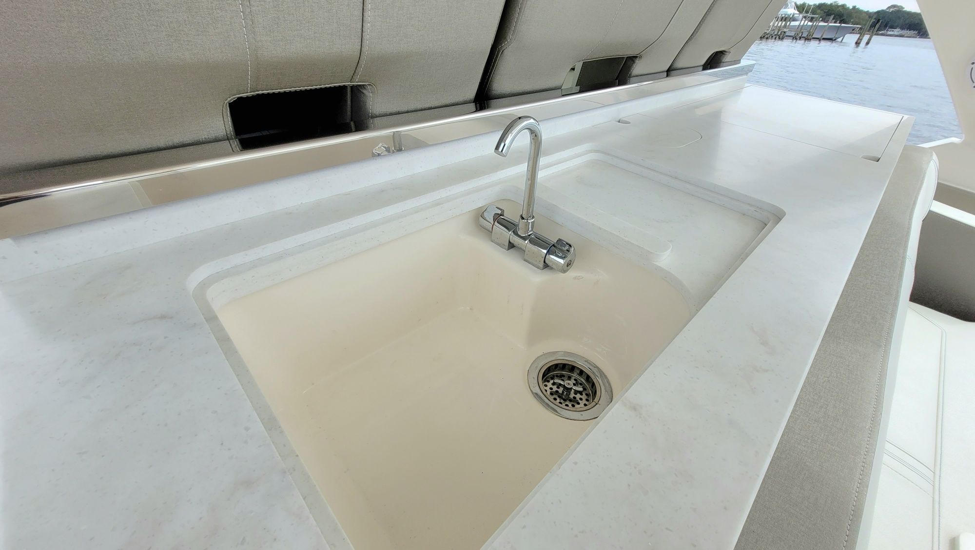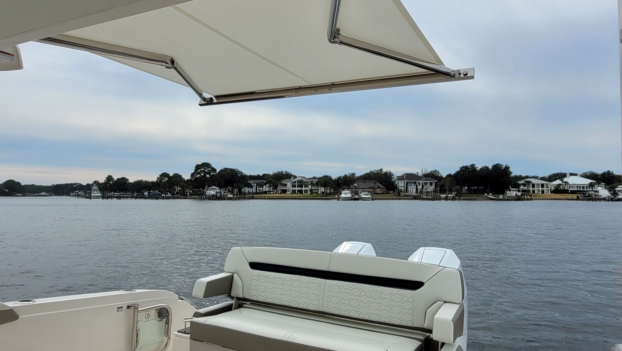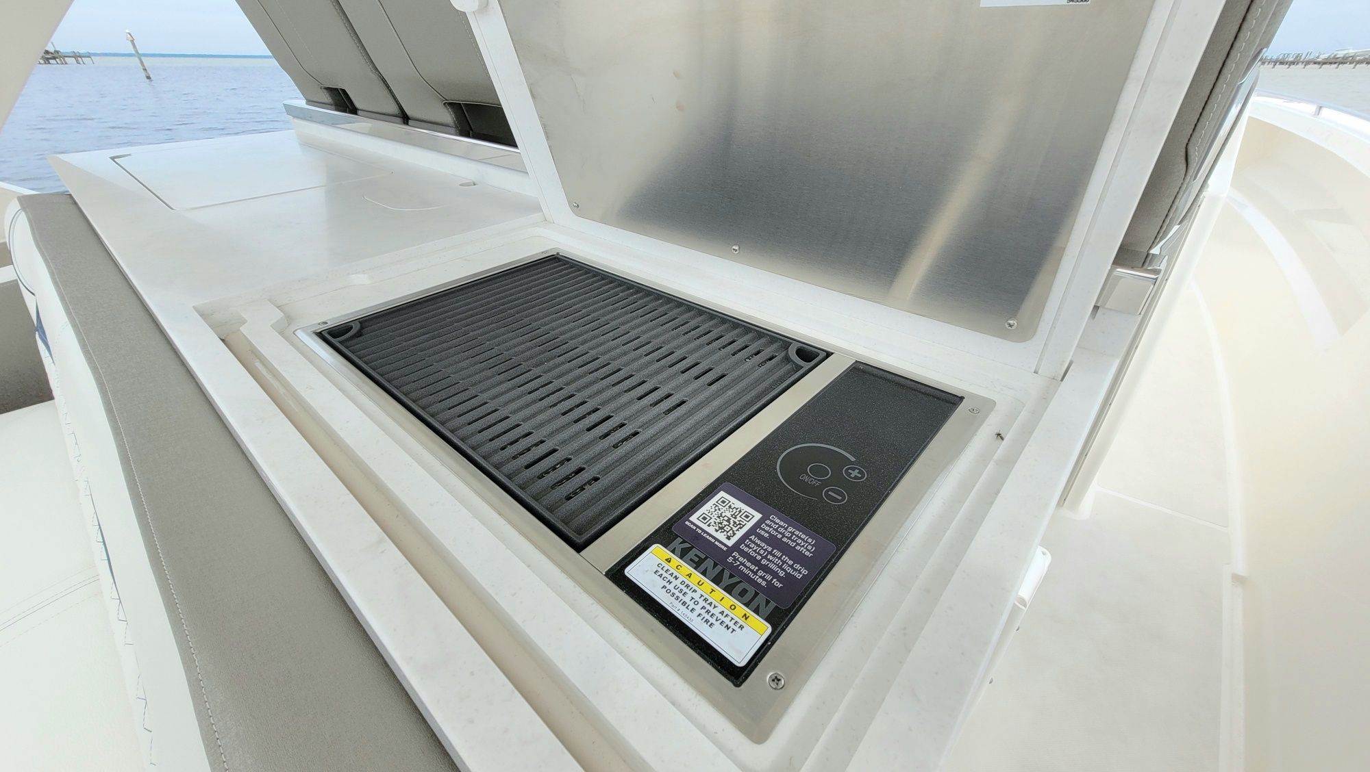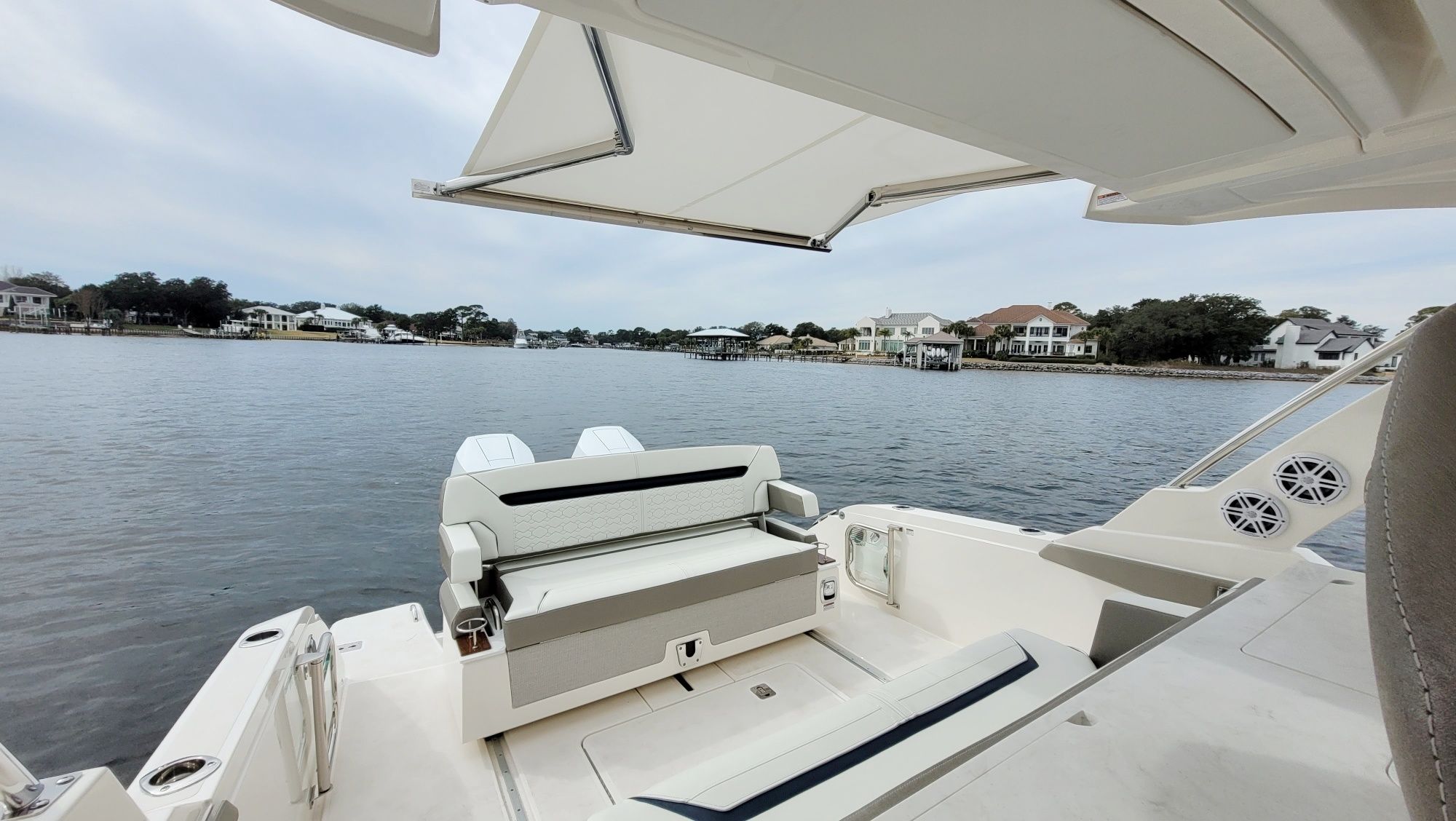 Other notable options include, Panda diesel generator 5KW, water heater, cockpit grill, cockpit TV, Drop curtain enclosure, dramatic lighting package, cool helm air and heat 6k, head macerator system, custom freshwater flush system for the generator and AC unit and custom Yeti cooler storage.
