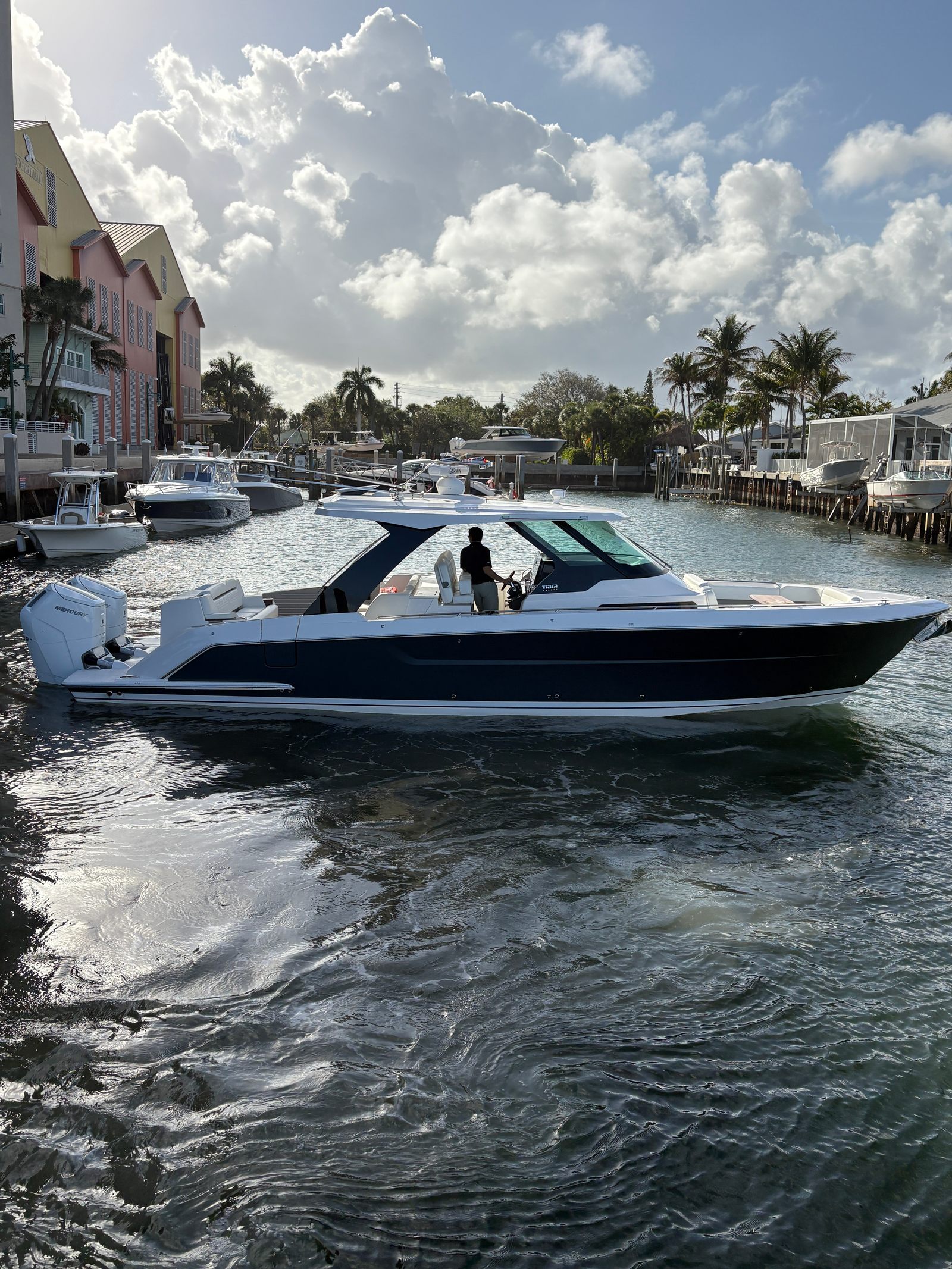 Power and precision are at the heart of the Tiara Yachts 39 LS. Equipped with twin Mercury V12 600 JPO engines, this yacht delivers a combined 1200 horsepower, ensuring exhilarating speed and smooth handling. The advanced Mercury JPO (Joystick Piloting for Outboards) system, integrated with a bow thruster, offers effortless maneuverability, making docking and navigating tight spaces a breeze. Whether you’re cruising along the coastline or embarking on longer journeys, the 39 LS provides a powerful and responsive ride that sets it apart from other yacht boats for sale.