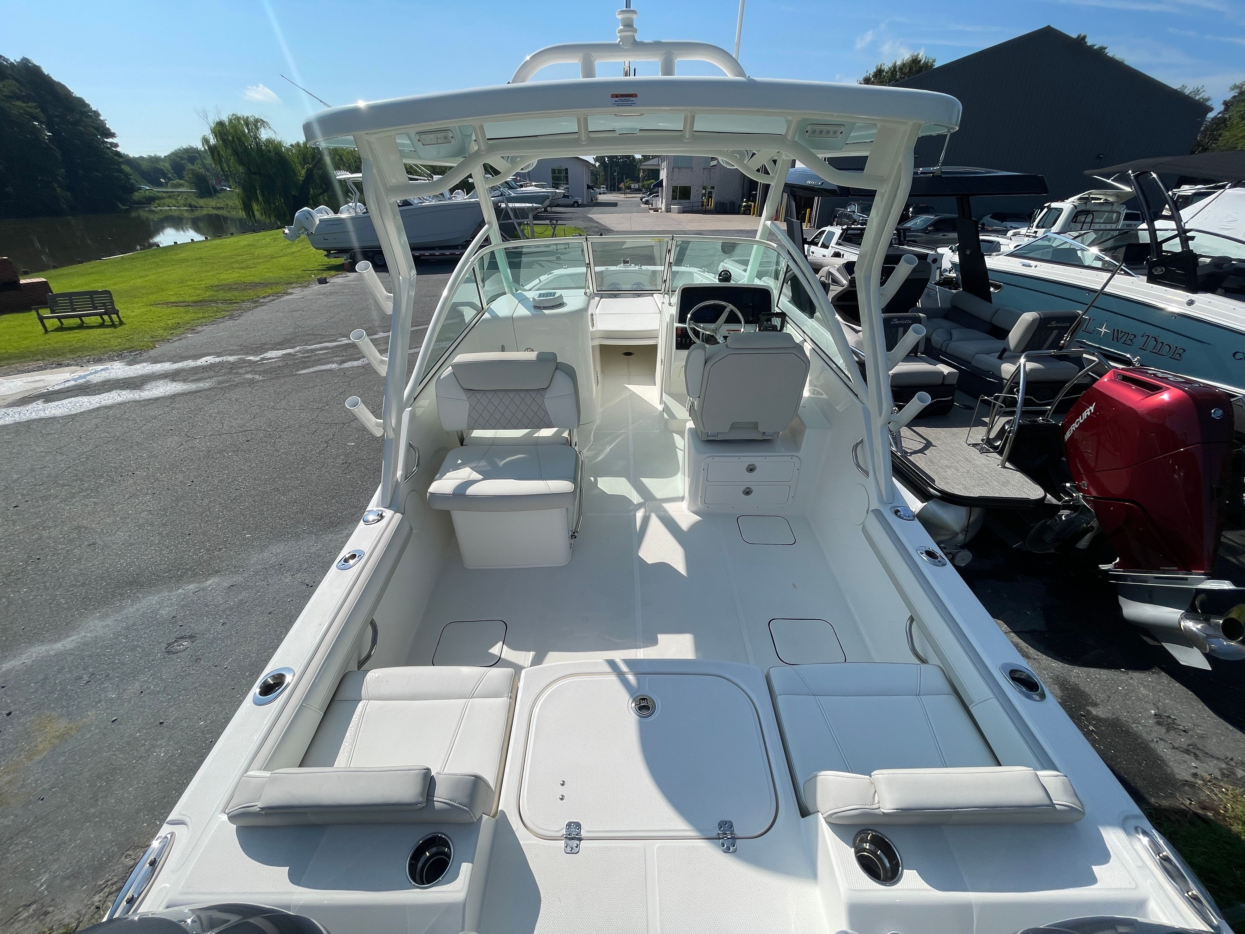 Step aboard and discover a host of premium features designed to elevate your boating experience. The fiberglass hardtop, complete with a powder-coated frame and rocket launchers, offers shade and protection while providing convenient storage for fishing rods. The hardtop ski tow opens up possibilities for water sports, making this Dual Console boat ideal for active families and thrill-seekers.Navigation and communication are effortless thanks to the Garmin GPSMAP® 8610xsv Chartplotter/Sonar Combo and the B150M-300w transducer, which deliver accurate mapping and fish-finding capabilities. The ICOM 315 VHF radio with an 8' antenna ensures clear communication, adding peace of mind during offshore excursions.Comfort and convenience are at the forefront of the World Cat 230 DC’s design. The removable bow table with cup holders creates a perfect setting for socializing or enjoying a meal with friends and family. The bow sunlounge filler with cushion transforms the bow area into a relaxing sun pad, ideal for soaking up rays or unwinding after a swim. Quick Release Fender Holders (4) make docking and undocking hassle-free, while the Yamaha CL-5 display provides intuitive engine monitoring and control.